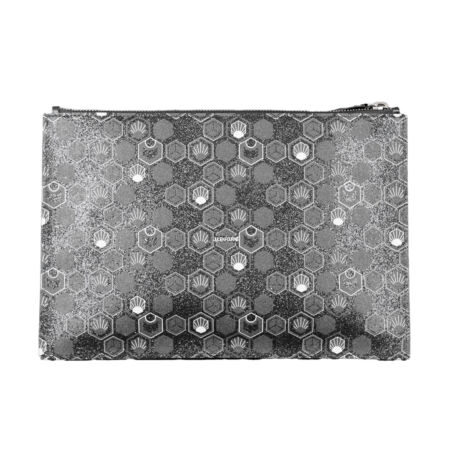 Plongez dans l’élégance stellaire avec la Pochette Pluton Midnight Black : une toile enduite noire subtilement incrustée de micro-paillettes, rehaussée du monogramme Hexagon dessiné par Julien Fournié, et ponctuée d’empiècements en veau grainé noir.