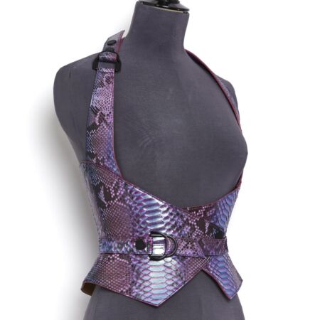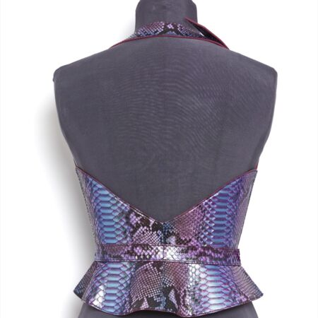 Ceinture Haute Couture corset harnais en python véritable posé sur collet nude surpiqué ton sur ton, à finition bord vif laqué, couleur sirène changeante.