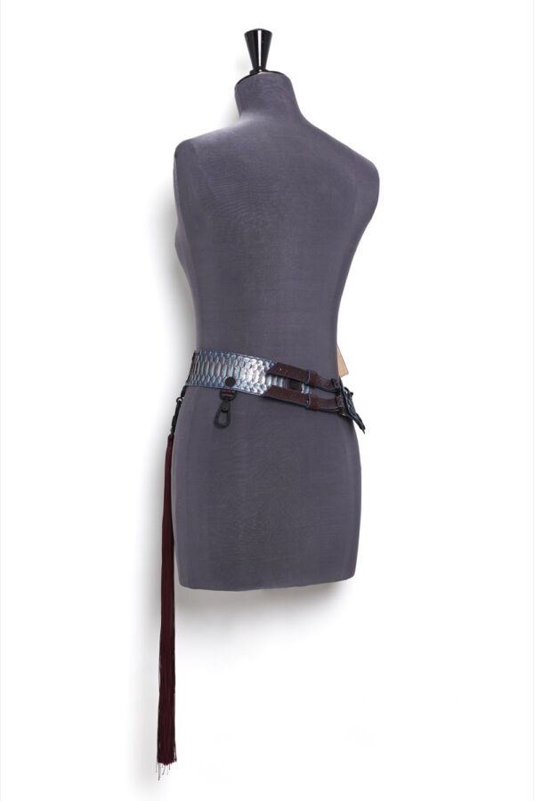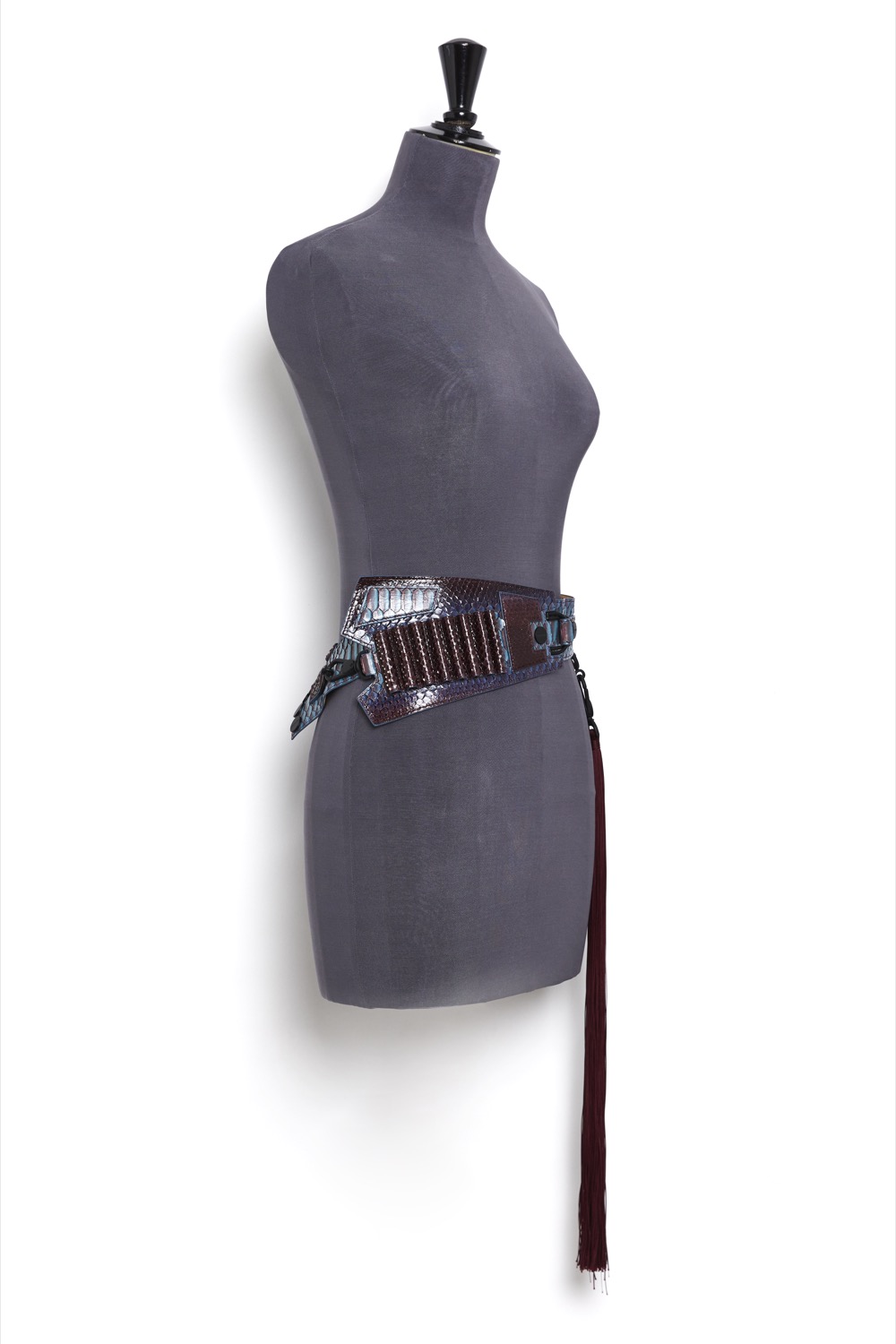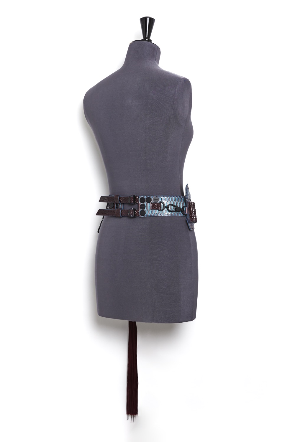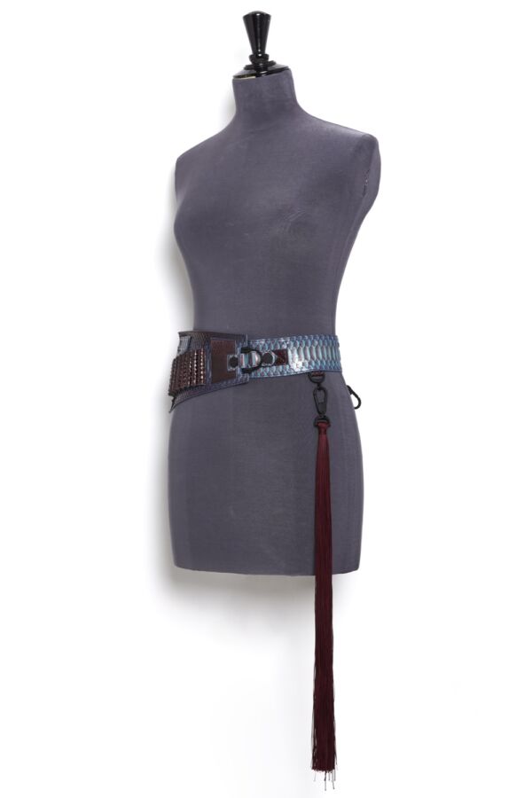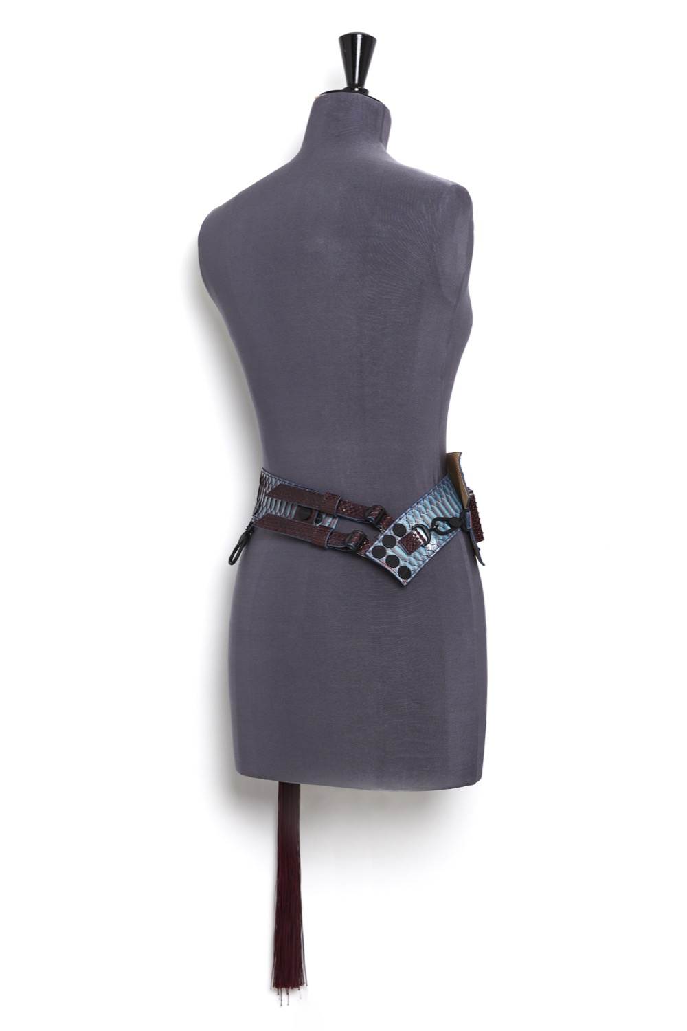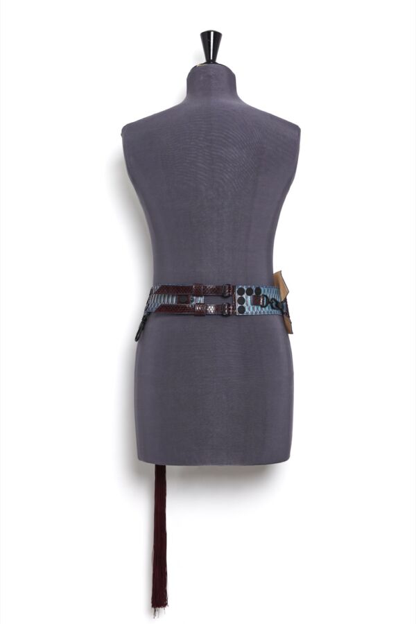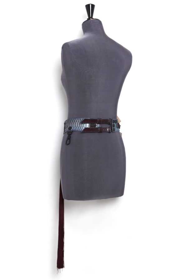 Cette ceinture Haute Couture à cartouchière fantaisie amovible est en python véritable changeant acqua marine/ Burgundy posé sur collet nude surpiqué ton sur ton.