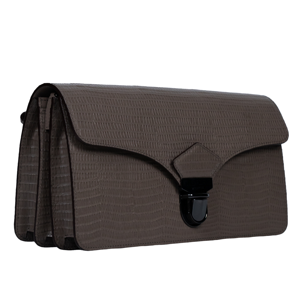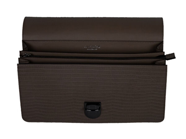 Cette Baguette est en cuir chocolat embossé façon lézard.