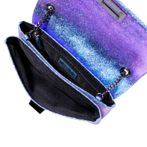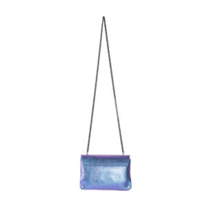 Ce sac de luxe se distingue par son cuir de veau irisé, oscillant du bleu au violet selon la lumière.