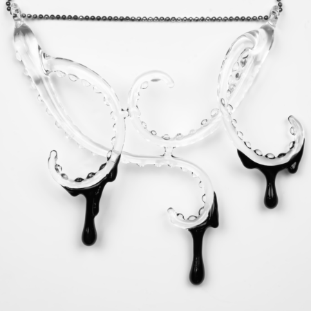 La forme est donnée par le souffle pour les pièces creuses, par le geste pour les pièces massives, la flamme est employée pour combiner le cristal noir et le verre translucide et obtenir les nuances exactes pour chaque bijou pendentif. Chaque bijou est donc unique.