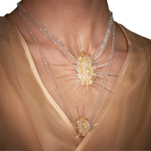 Julien Fournié a imaginé une série de bijoux dont les spectaculaires tiare et harnais portés par la « Dark Mermaid ». Julien Fournié a fait appel à Adrian Colin pour donner vie à cette ligne de bijoux en verre soufflé. Adrian Colin est Meilleur Ouvrier de France 2011 et Directeur adjoint commission métiers d’art MOF. Il est verrier au chalumeau à Dinan. Il exécute ses oeuvres à base de baguettes et de tubes de verre qui sont fusionnés.