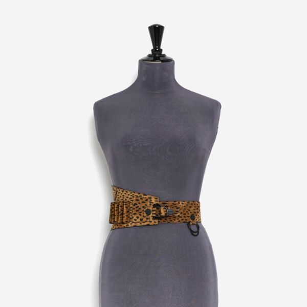 Ceinture à cartouchière amovible en veau velours fauve tacheté noir, posé sur collet nude surpiqué ton sur ton, à finition bord vif laqué.