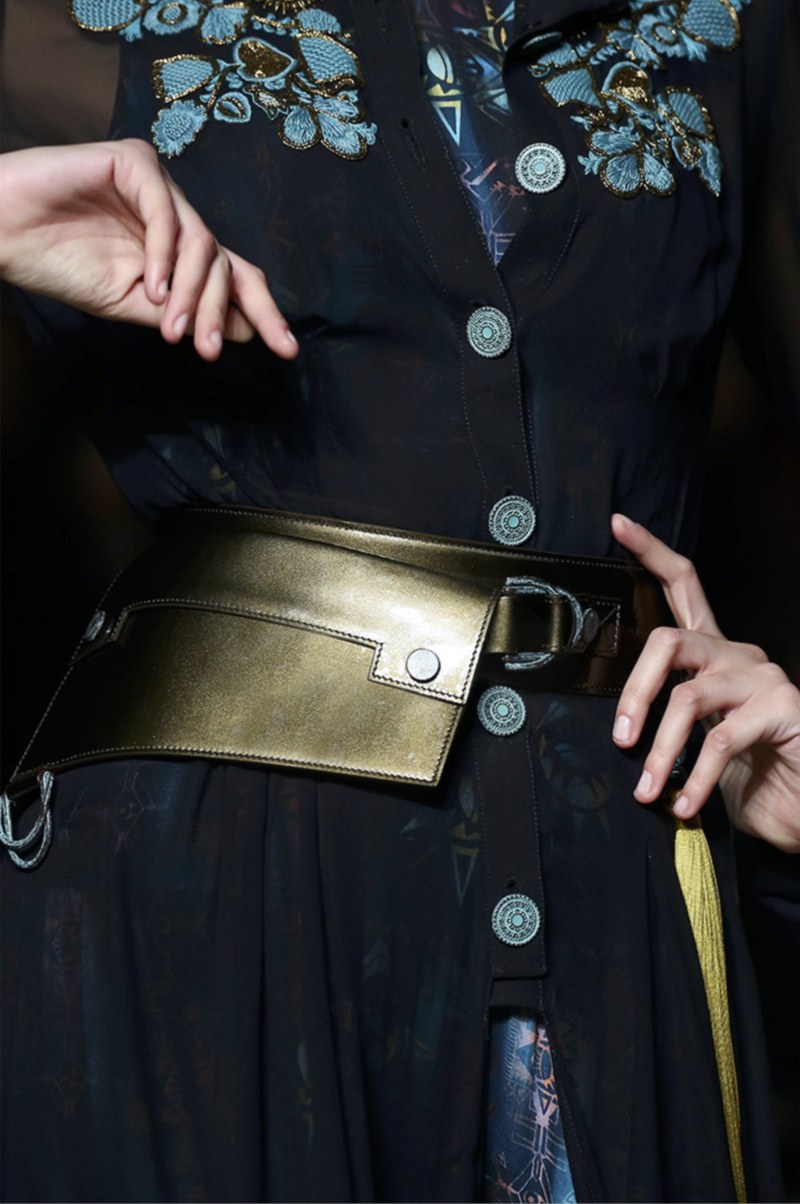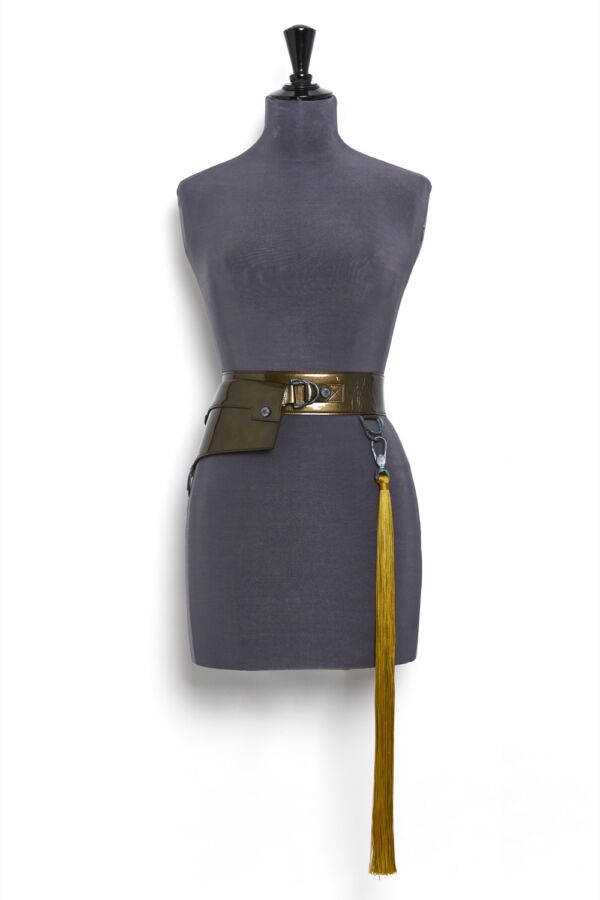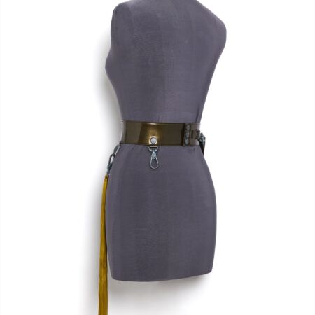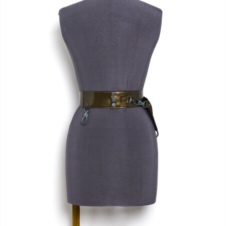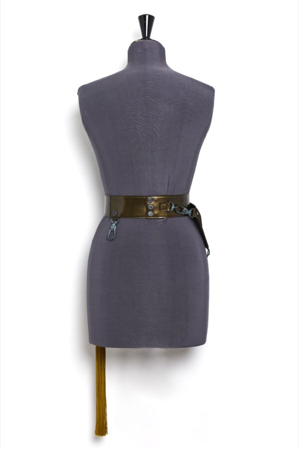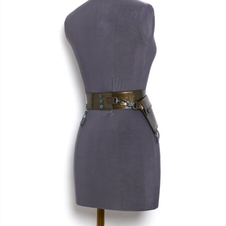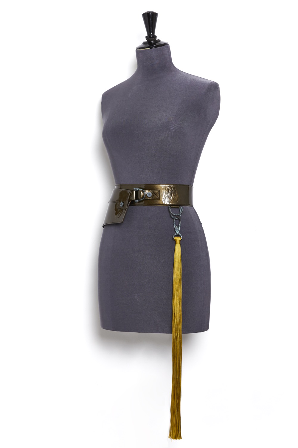Ceinture Haute Couture à pochette en cuir verni métallisé bronze à sac pochette asymétrique amovible, posé sur collet nude surpiqué ton sur ton, à finition bord vif laqué.