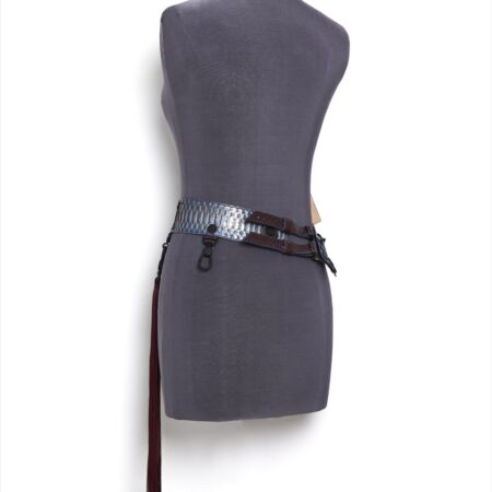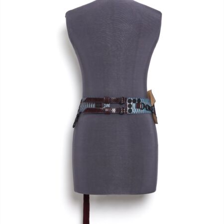 Cette ceinture Haute Couture à cartouchière fantaisie amovible est en python véritable changeant acqua marine/ Burgundy posé sur collet nude surpiqué ton sur ton.