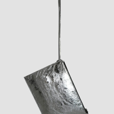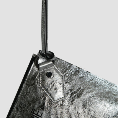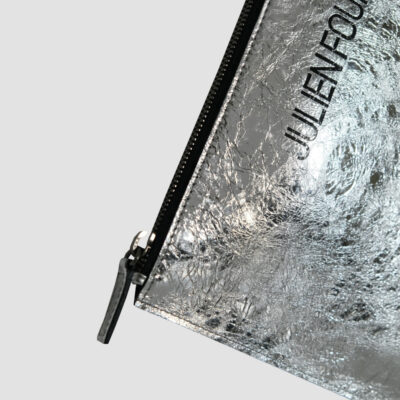 Pour la première fois, elle se décline en cuir métallisé à l’effet miroir brisé, une matière spectaculaire qui capte la lumière et révèle chaque mouvement. Le logo Julien Fournié, apposé comme une signature graphique, crée un dialogue subtil entre texture et identité.
