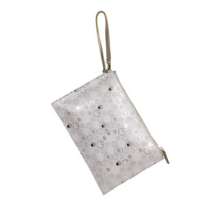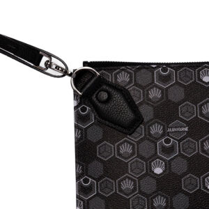 Cette pochette luxe est fabriquée en cuir et en toile enduite, ornée du monogramme exclusif Hexagon de la Maison Julien Fournié. Ce monogramme est un véritable symbole de l’élégance et du savoir-faire de la marque.