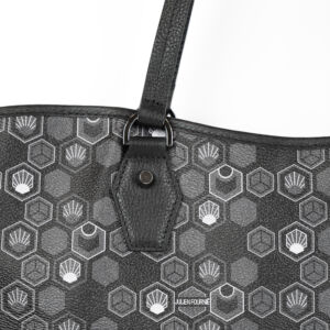 Les différents sacs de luxe et pochette luxe de la ligne Hexagon sont taillés dans une toile enduite solide et souple et décorée par le nouveau monogramme exclusif Hexagon, signature de la Maison dessiné et crée par le couturier Julien Fournié.