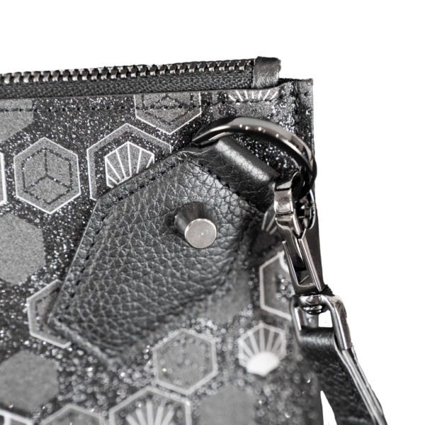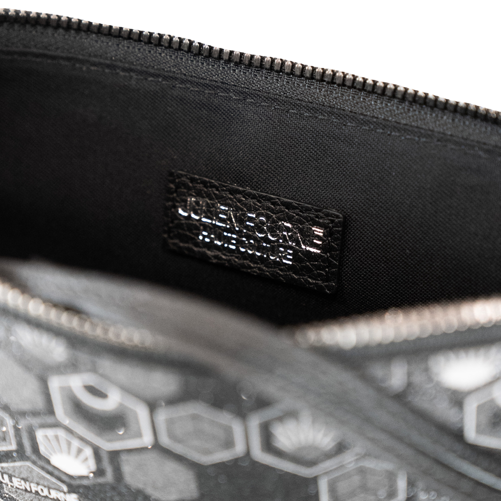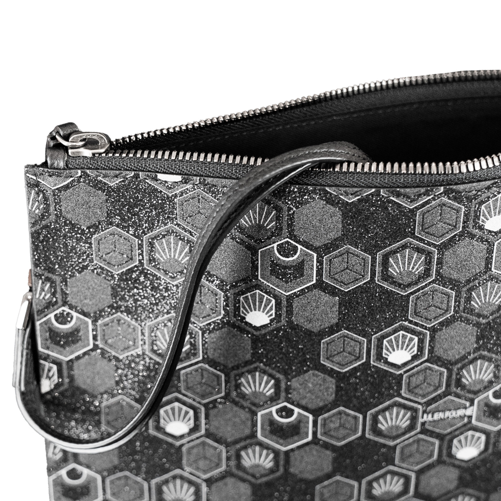 Julien Fournié dévoile sa Pluton dans un noir abyssal, sa toile finement constellée de micro-paillettes rappelant un ciel étoilé au cœur de la nuit. À chaque éclat, la lumière danse sur le monogramme Hexagon, hommage à l’infini ballet des alvéoles d’abeille et à une vision cosmique qui transcende l’ordinaire. Que vous la glissiez sous votre bras pour un rendez-vous en ville ou que vous la passiez à la main en soirée, cette pochette de luxe affirme son caractère couture. Ses finitions méticuleuses — fermoirs ciselés, surpiqûres invisibles et métalleries fumées — dessinent le contour d’un accessoire unique, signé d’une empreinte à la fois audacieuse et poétique. Portez-la au poignet grâce à sa dragonne en cuir noir ou retirez-la pour révéler un petit bijou de raffinement : la Pluton se métamorphose, se réinvente, et vous suit partout où l’élégance vous mène.