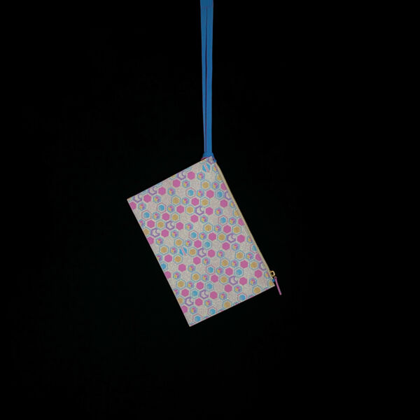 Le monogramme Hexagon vient d’une réflexion sur l’infini. Je suis parti du motif créé par la nature, à savoir les ruches des abeilles. Une vue comme de l’intérieur d’un scaphandre venu d’un autre univers. Du scaphandre on peut découvrir : les planètes s’aligner, le soleil se lever et le noir de l’espace à l’infini.