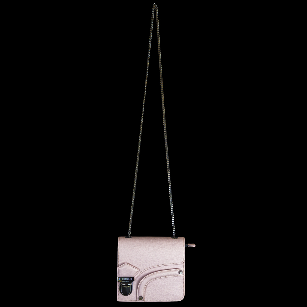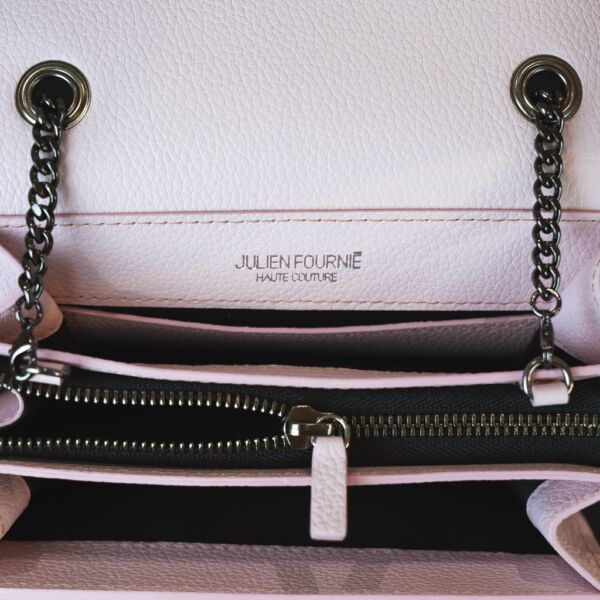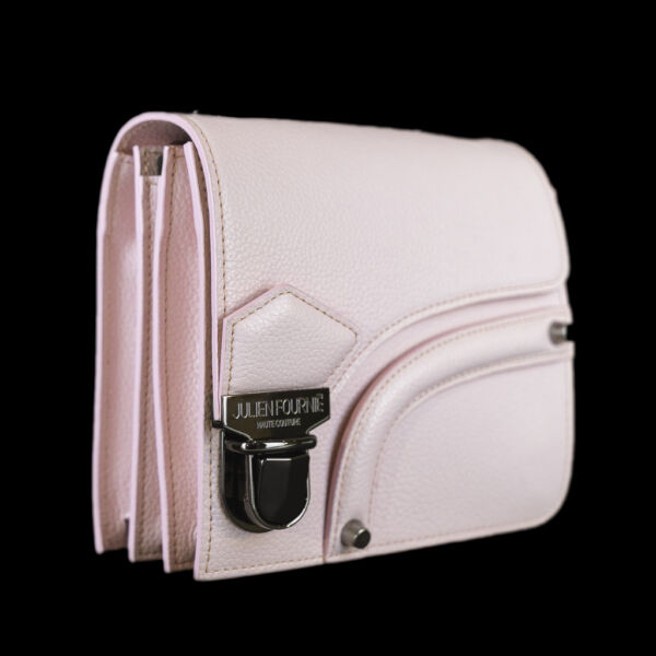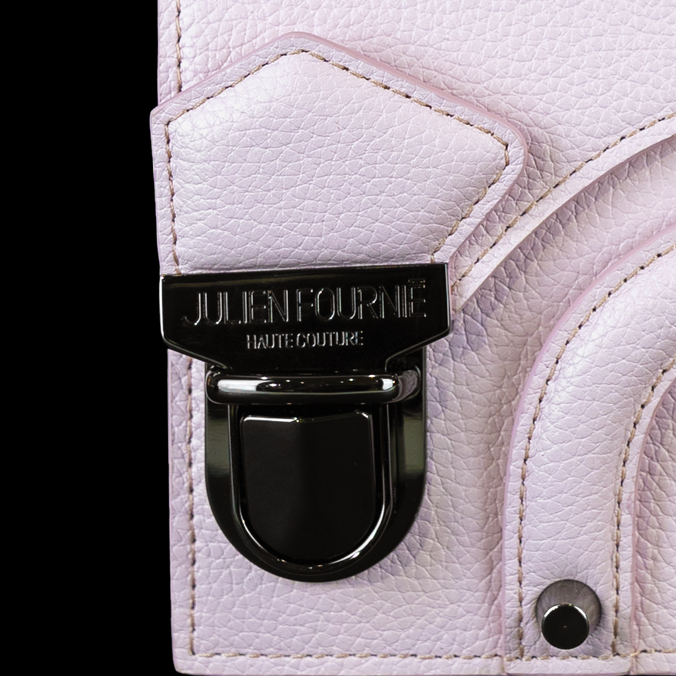 Ce modèle se distingue par son cuir de veau grainé couleur rose bonbon, sublimé par des lignes géométriques et un galbe affirmé. La chaîne argentée, d’une brillance subtile, se déclipse pour révéler une lanière frontale innovante : on le porte à l’épaule ou à la main selon son humeur. La fermeture tuck en métal, finement gravée du logo Julien Fournié Haute Couture, affirme son appartenance à l’univers couture le plus exclusif.