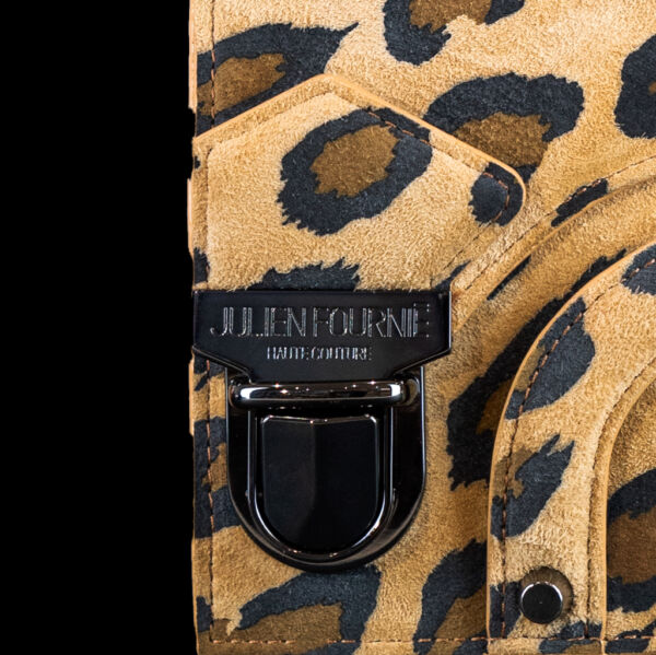 Ou de façon inédite à la main grâce à une lanière devant le sac. La fermeture tuck métallique est logotypée Julien Fournié Haute Couture.