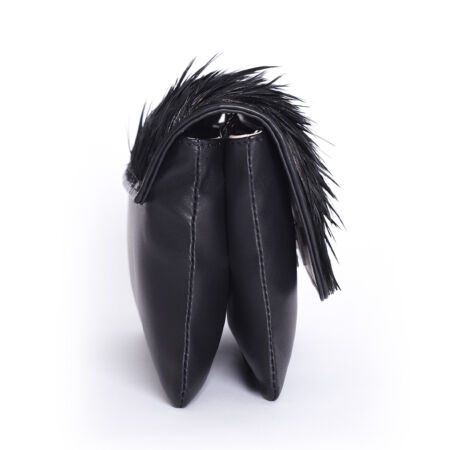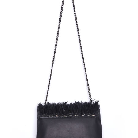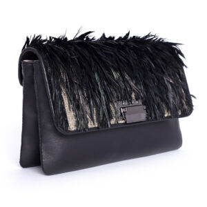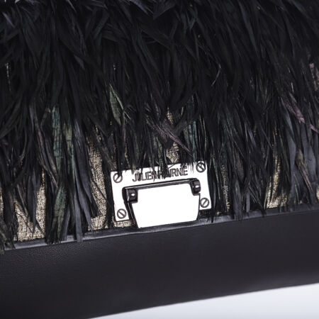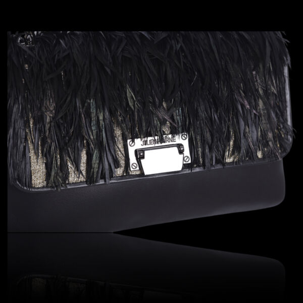 Ce bijou de maroquinerie unit la légèreté des plumes noir à l’éclat de l’or : chaque plume est minutieusement brodée à la main sur un tissage sergé de fils d’or véritable, ponctué d’une base en agneau plongé noir d’une douceur incomparable. Au toucher, la peau d’agneau offre un grain délicat, contrastant subtilement avec le scintillement chaud des fils d’or qui captent la lumière à chaque mouvement.