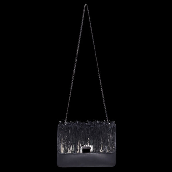 • Chaîne amovible de 121 cm finition “canon de fusil”, apportant une nuance cendrée et sophistiquée, qui se positionne aussi bien en bandoulière qu’en porté épaule.