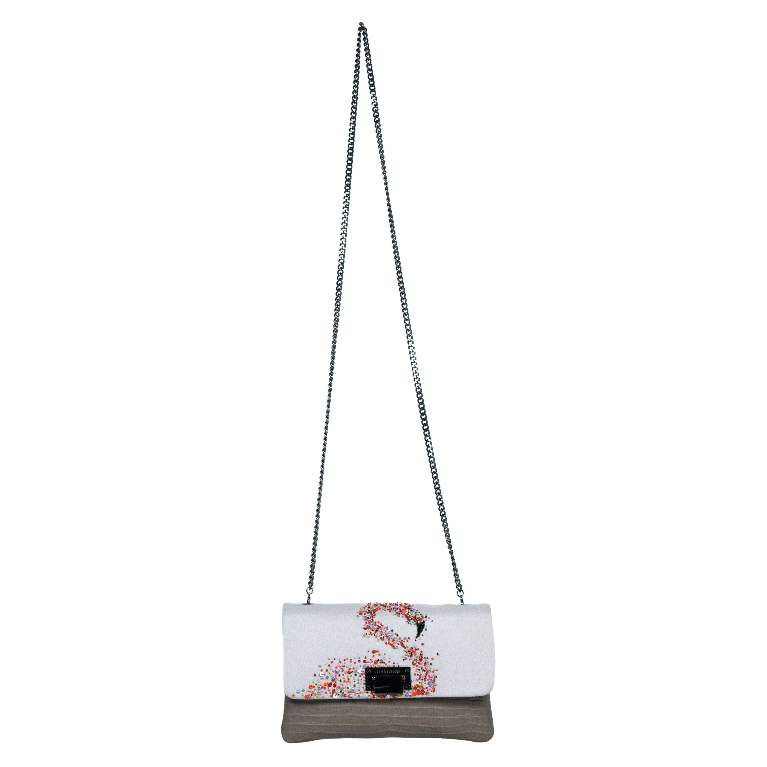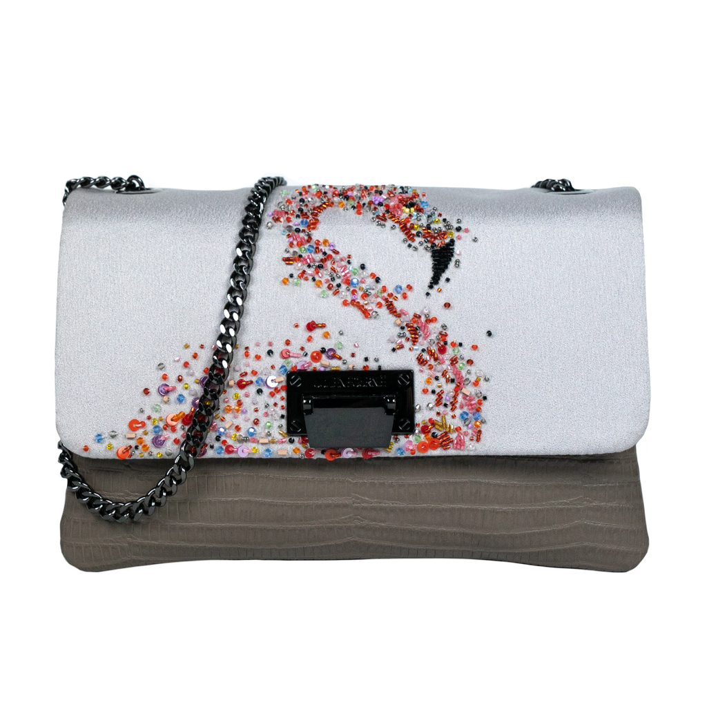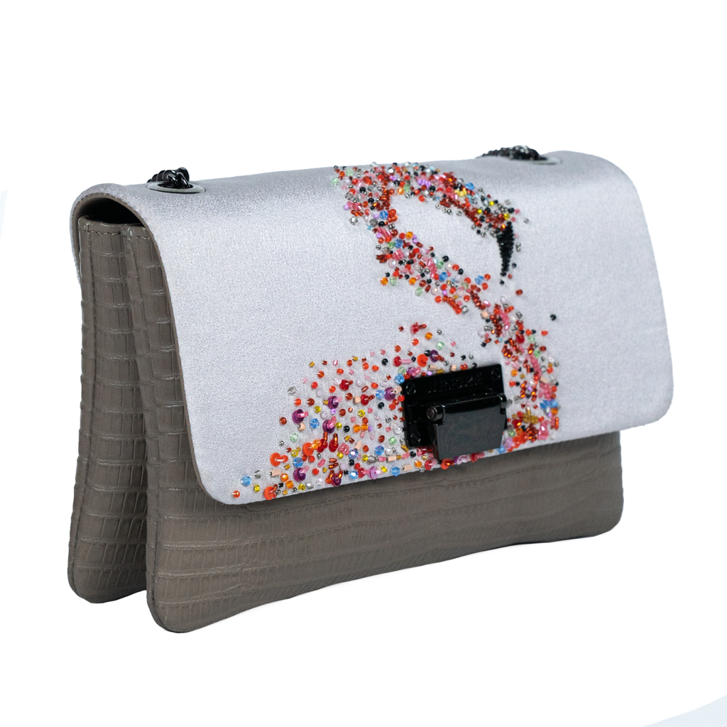 Ce sac à main de luxe, modèle iconique la Maison, est brodé de cristal, sequins et rocailles. Le motif Crazy Flamingo dont une allure unique à ce sac d'exception. Le cuir est embossé alligator.