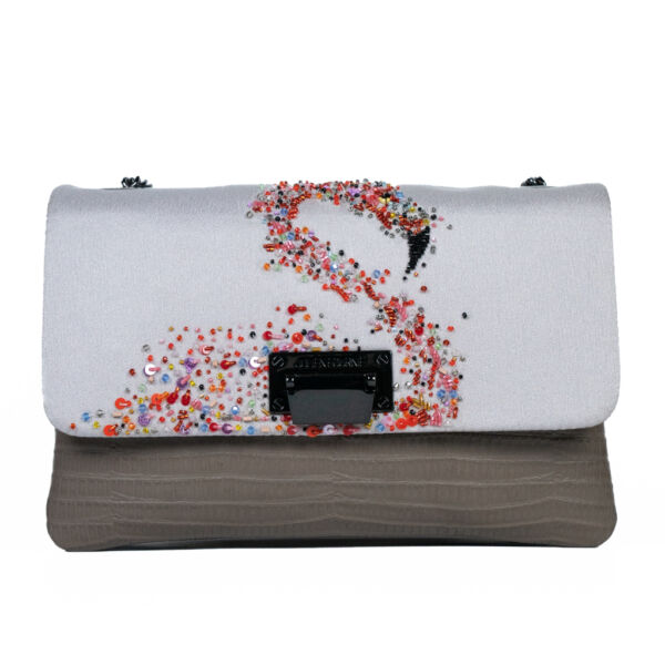 Ce sac à main de luxe, modèle iconique la Maison, est brodé de cristal, sequins et rocailles. Le motif Crazy Flamingo dont une allure unique à ce sac d’exception. Le cuir est embossé alligator.