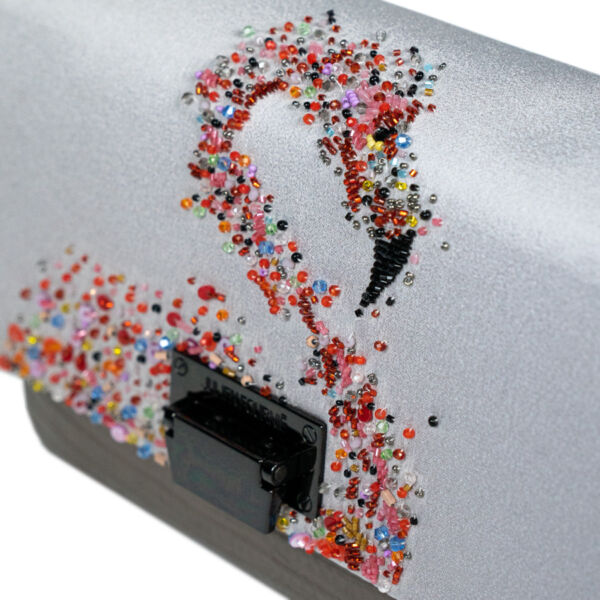 Un véritable chef‑d’œuvre de maroquinerie, ce sac de luxe est façonné en satin de soie somptueusement brodé du motif Crazy Flamingo, éclatant de cristaux, sequins et rocailles. Le cuir de veau embossé alligator vient sublimer les soufflets latéraux, apportant texture et profondeur à cette création d’exception.