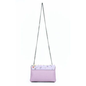 Les soufflets latéraux sont en cuir d’agneau plongé couleur lavande. La chaîne amovible et réglable (Longueur 121cm) et les métalleries sont de couleur « canon de fusil ».