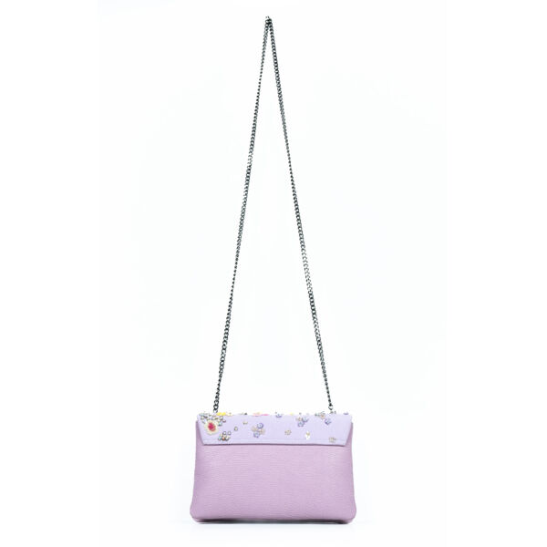 Les soufflets latéraux sont en cuir d’agneau plongé couleur lavande. La chaîne amovible et réglable (Longueur 121cm) et les métalleries sont de couleur « canon de fusil ».
