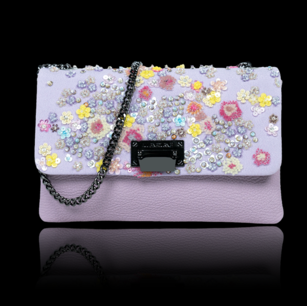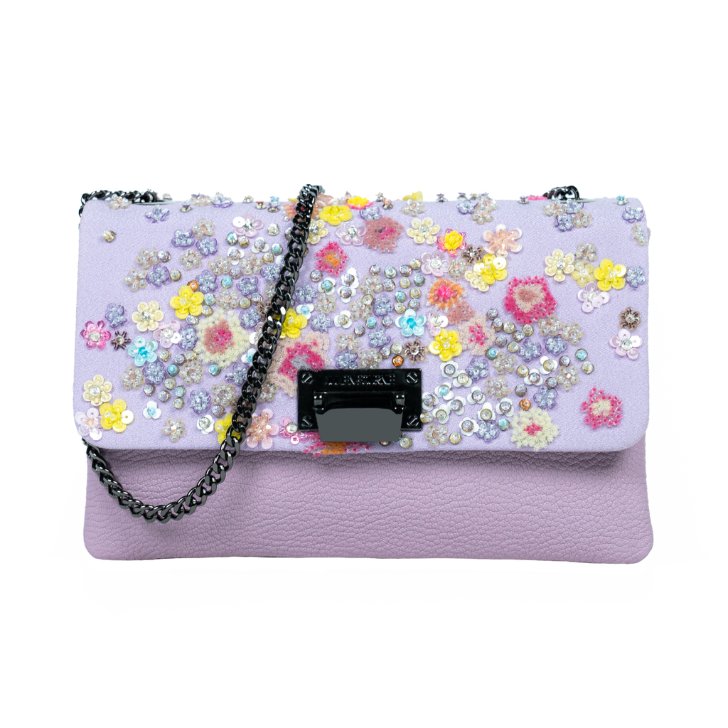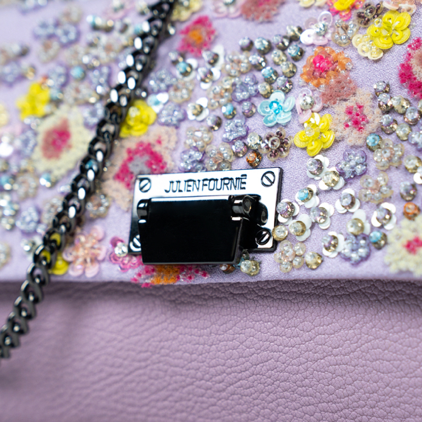 Sac à main Haute Couture Julien Fournié Haute Couture Ce sac de luxe à rabat en satin de soie lilas brodé de fleurs en 3D en sequins, cristaux et tulle de soie, est en cuir d’agneau plongé couleur lavande.