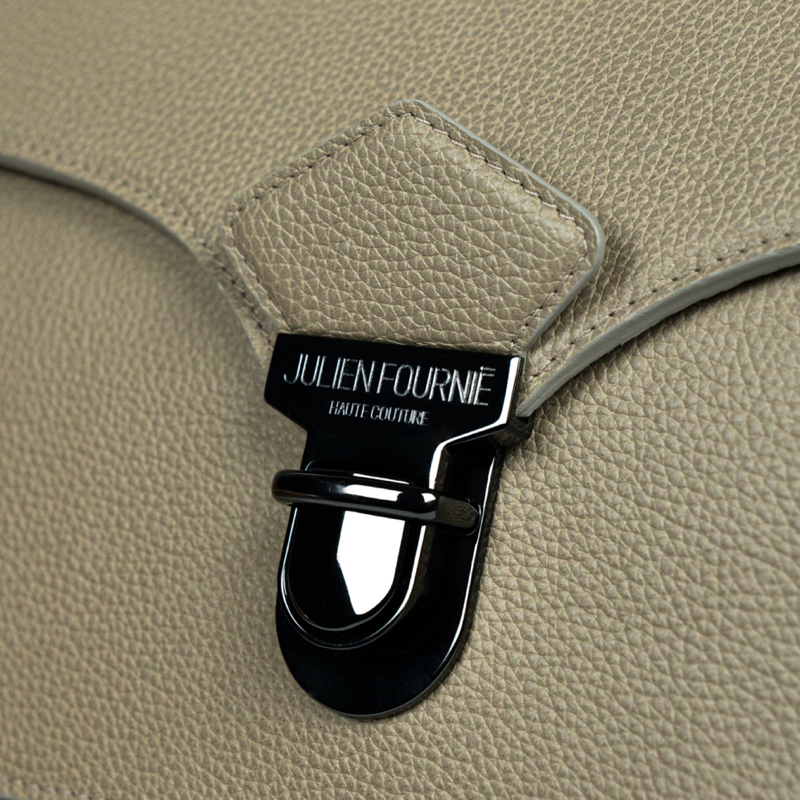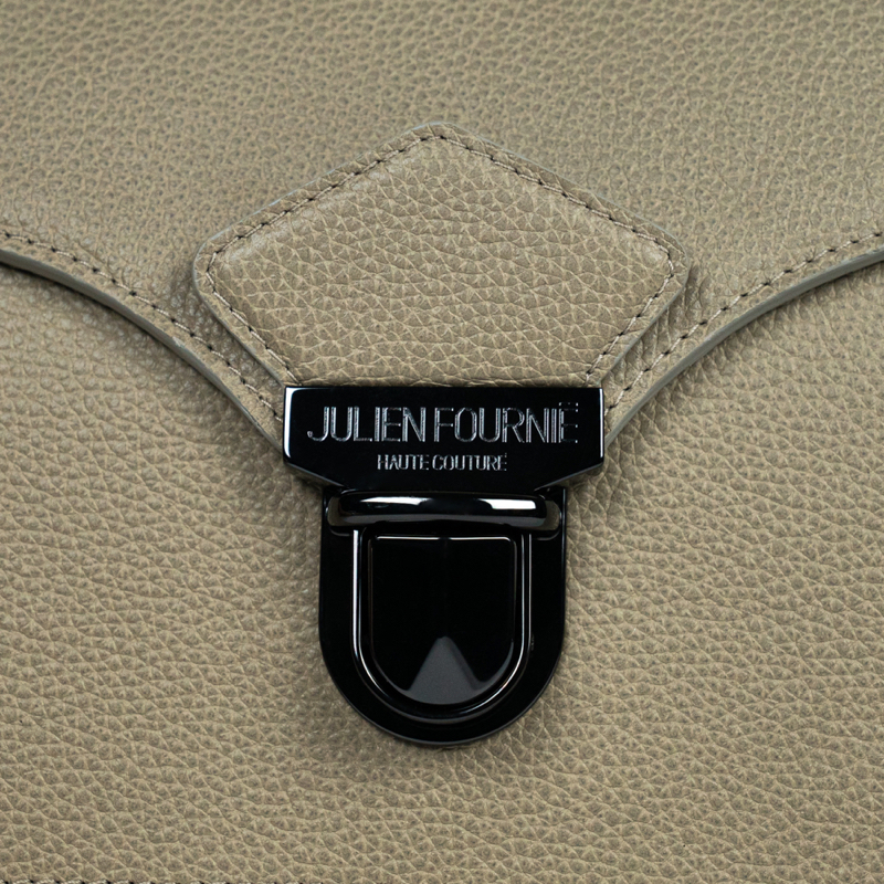 Un fermoir tuck couleur canon de fusil et siglé lui donne son caractère au Sac Mercure.