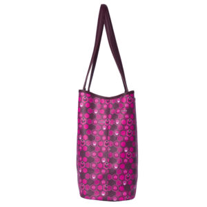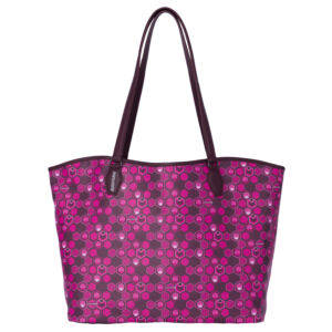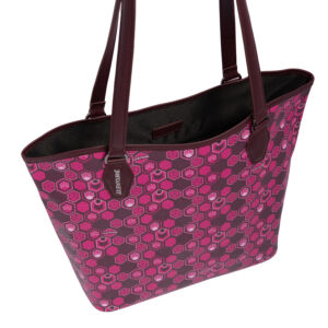 Sac cabas en toile enduite fuschia habillée du monogramme exclusif Hexagon dessiné par Julien Fournié et en cuir de veau grainé bourgogne.