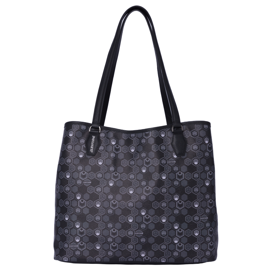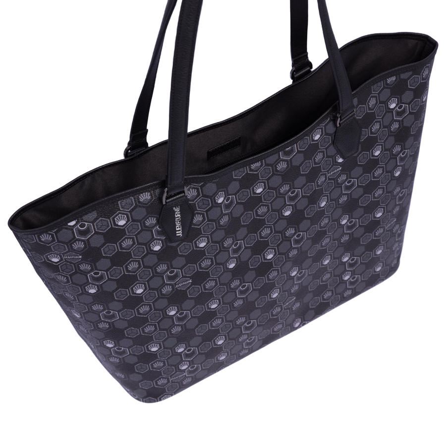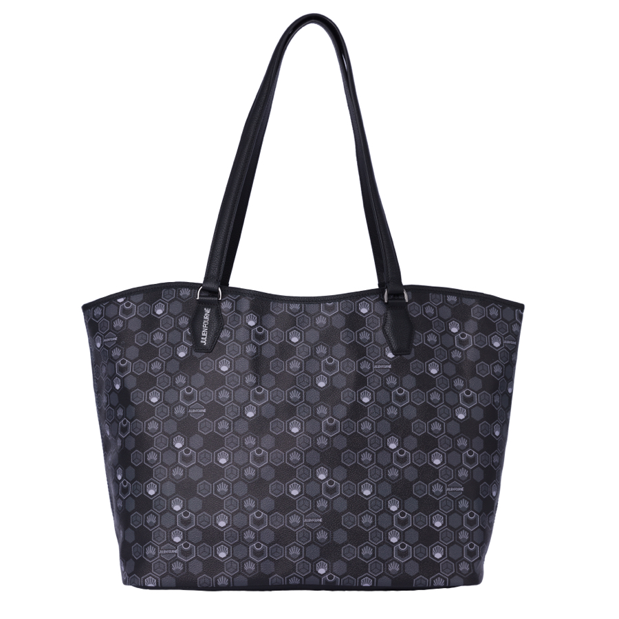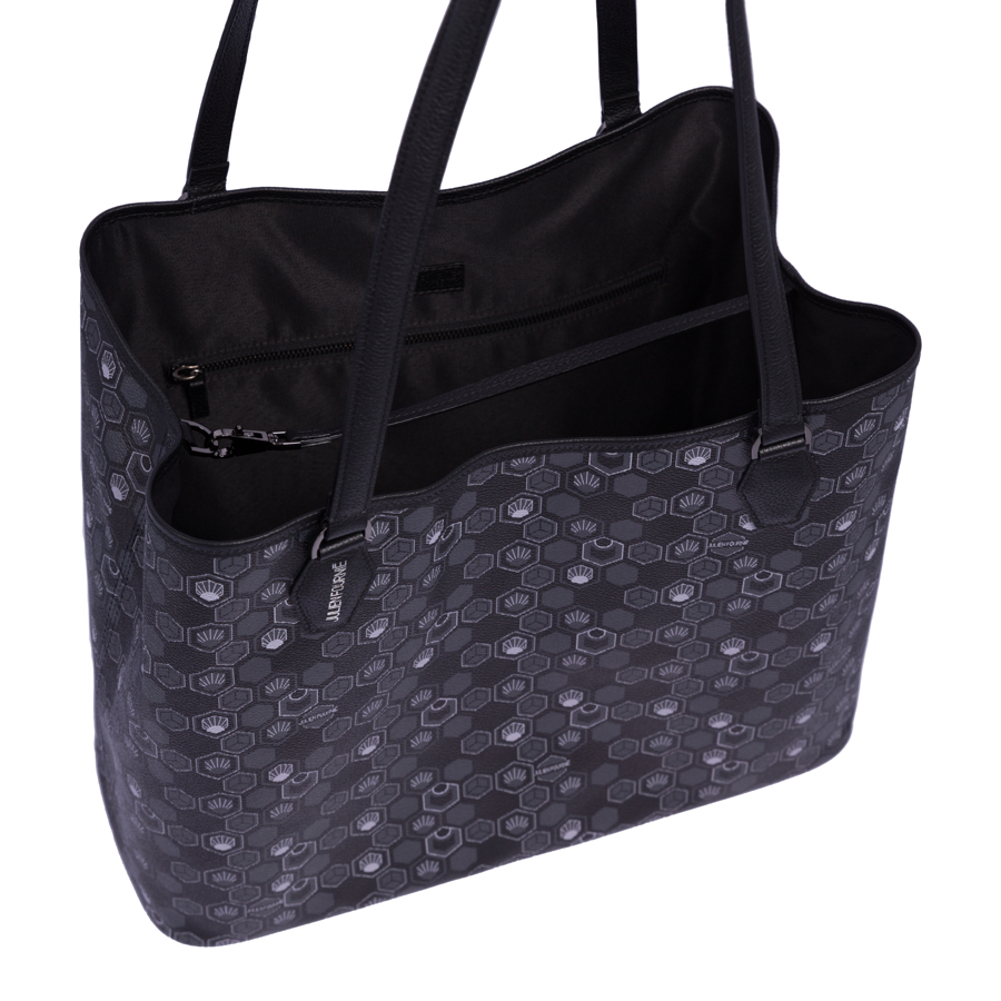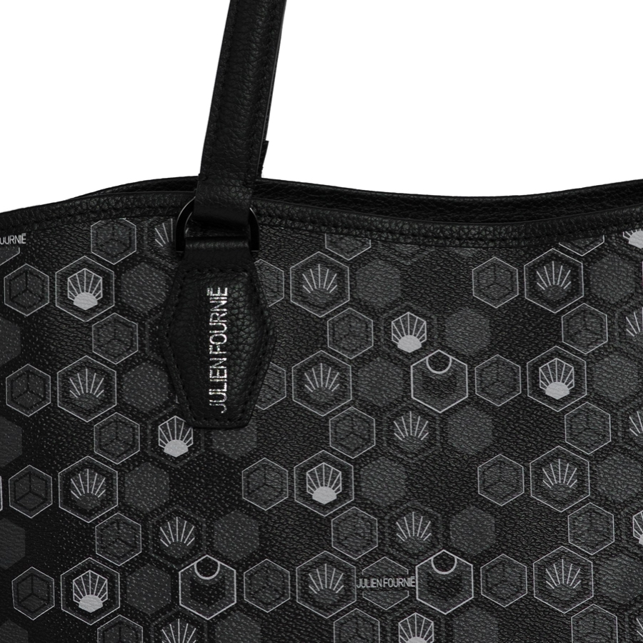 Ce Sac cabas noir est en toile enduite décorée du Monogramme exclusif Hexagon crée par Julien Fournié et cuir de veau grainé noir