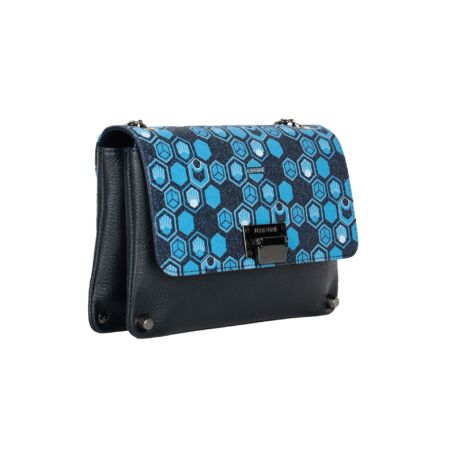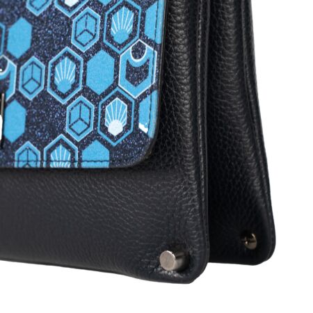 Les reflets scintillants, imaginés comme des poussières d’étoiles, révèlent un jeu de lumière saisissant à chaque mouvement, tandis que les empiècements en cuir grainé bleu nuit soulignent sa structure avec raffinement.