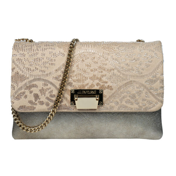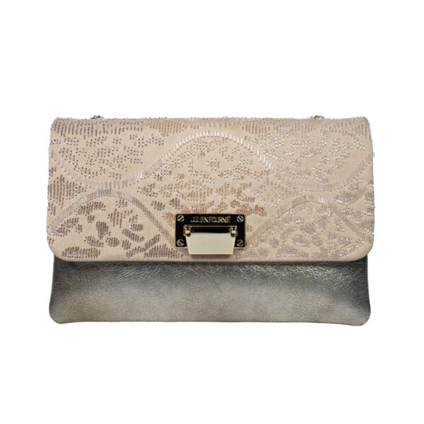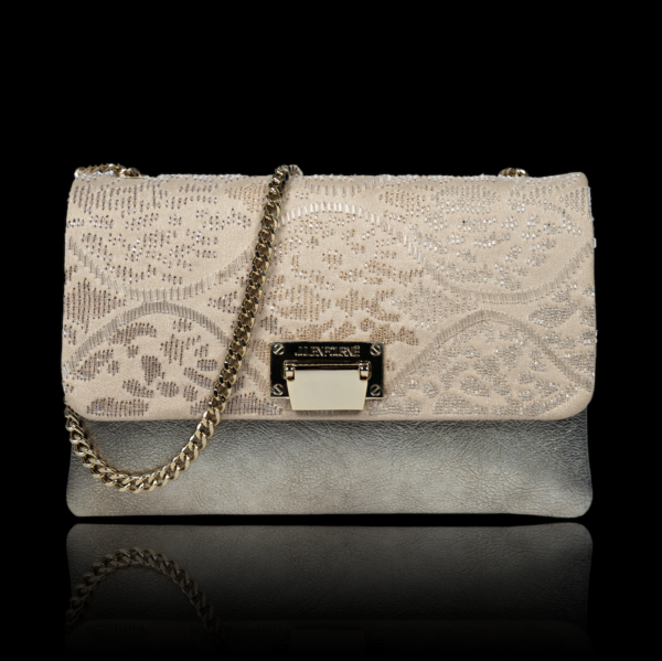 Sac à main à rabat satin nude brodé de motifs moucharabieh motifs Sunshine graphiques en dégradé de fils d’or scellés dans des tulles de cristal, cuir d’agneau white gold.