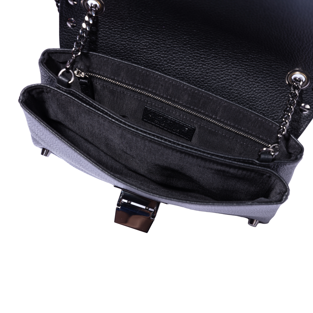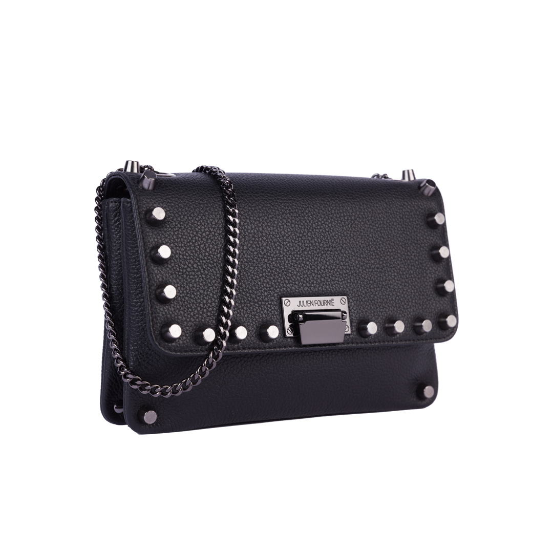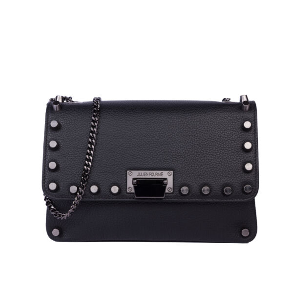 Sac de luxe Julien Fournié Haute Couture Ce Sac de luxe noir est en cuir de veau grainé. La chaîne amovible et réglable (Longueur 121cm) ainsi que les métalleries sont couleur « Canon de fusil ». L’intérieur ce sac à main est en faille gros grain noir, avec une double poche intérieure à soufflet et une poche intérieure zippée. [modula id= »9674″]