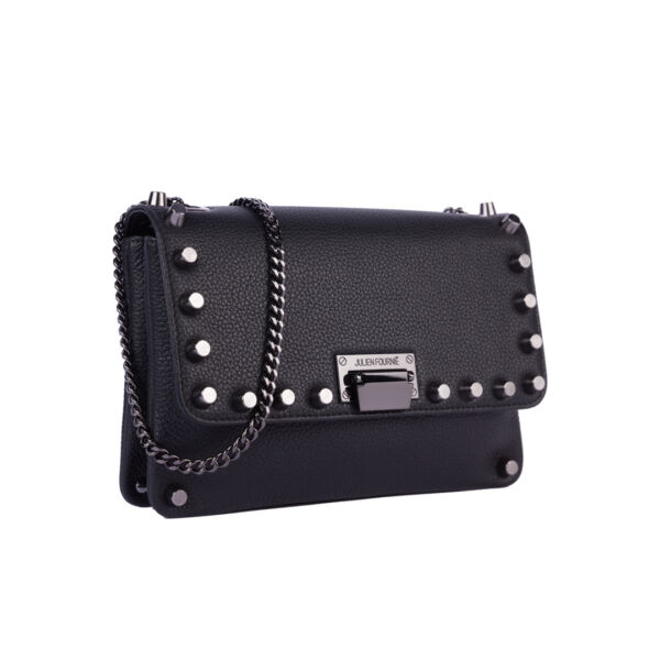 Le nouveau sac à main Premier Arcadia présenté lors du défilé de la collection de Haute Couture First Créatures. Ce sac de luxe noir en cuir grainé noir, est entièrement décoré de rivet sur les bords ce qui lui donne son caractère.