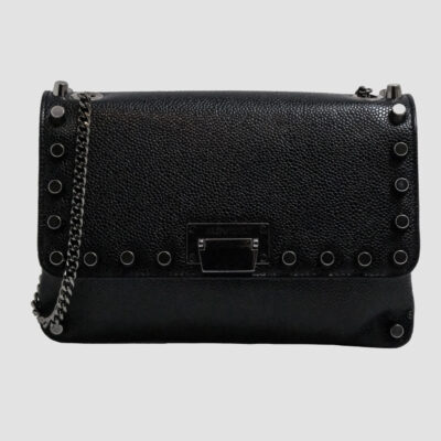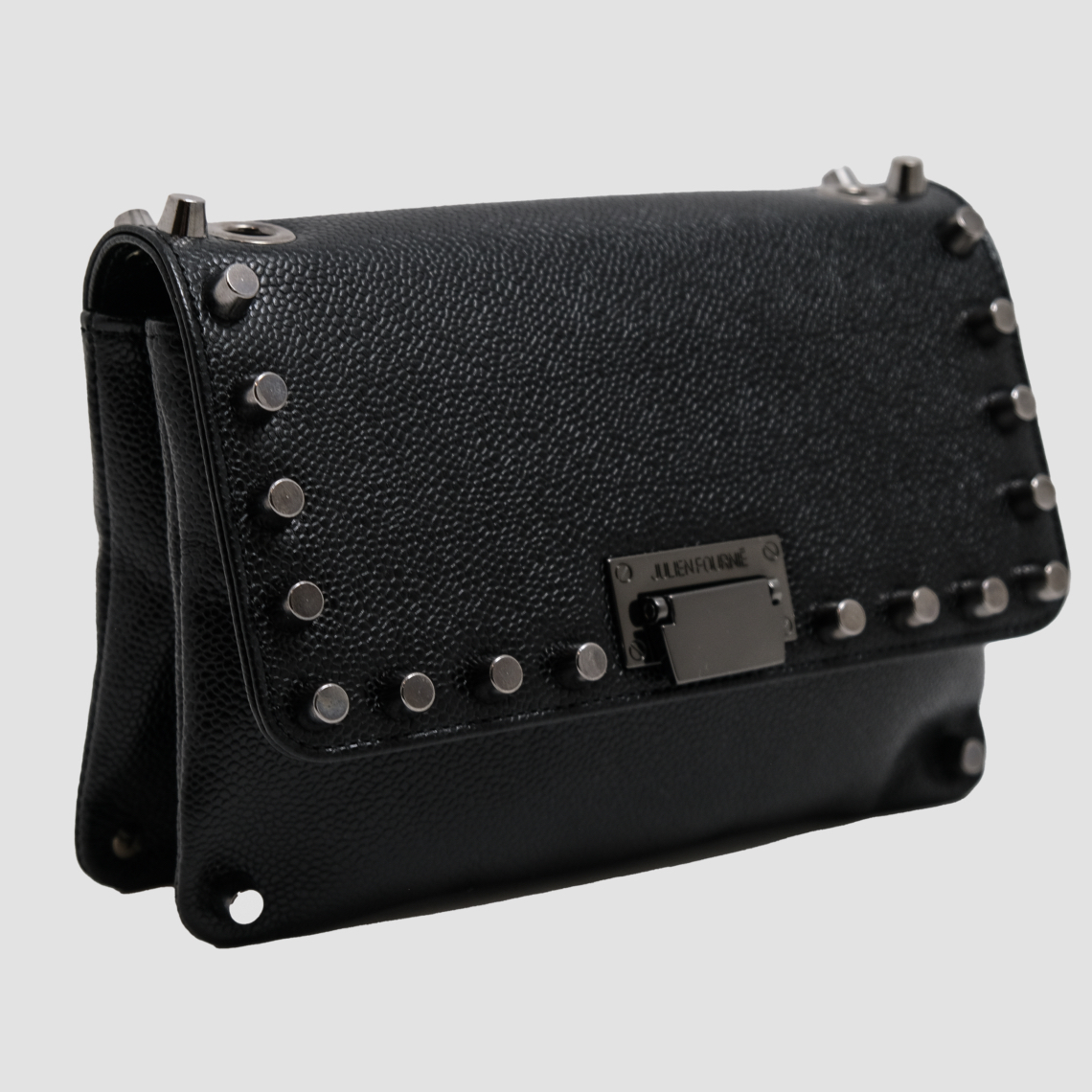 Habillé d’un cuir noir profond, ce modèle se distingue par des finitions irréprochables : le logo Julien Fournié est subtilement embossé sur le rabat métallique, et l’agencement optimisé des poches intérieures allie utilité et raffinement.