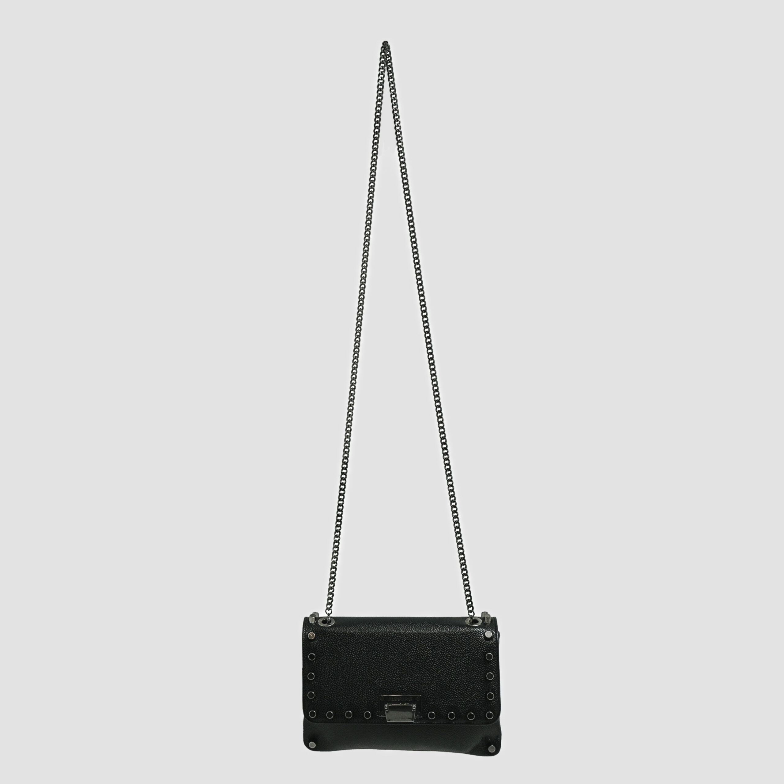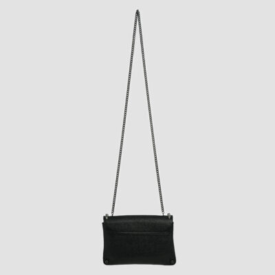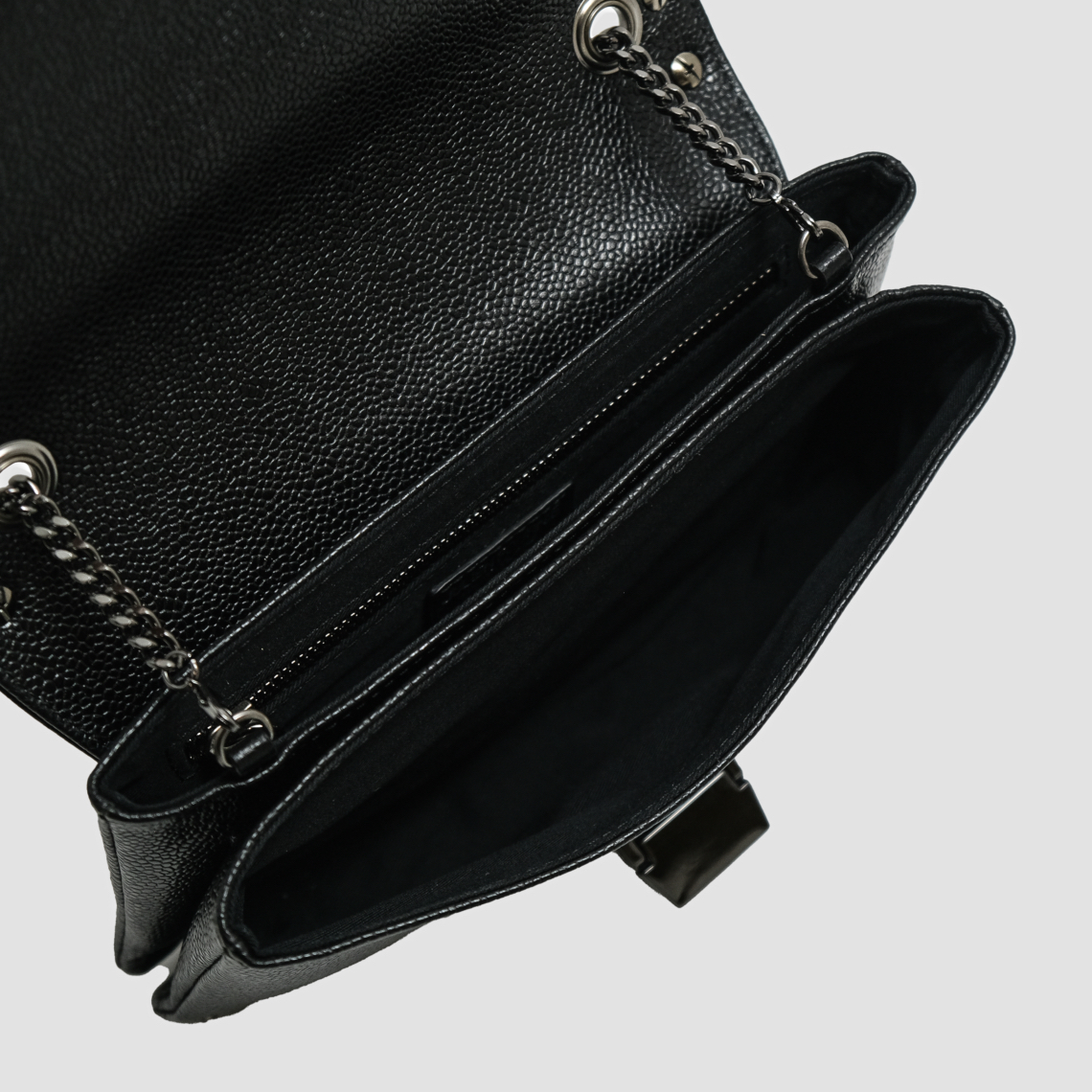 La chaîne de 121 cm, pensée comme un véritable bijou, prolonge cette idée d’armure élégante. L’intérieur, en faille gros grain noire, accueille une double poche intérieure à soufflet ainsi qu’une poche zippée, offrant une organisation discrète et raffinée.