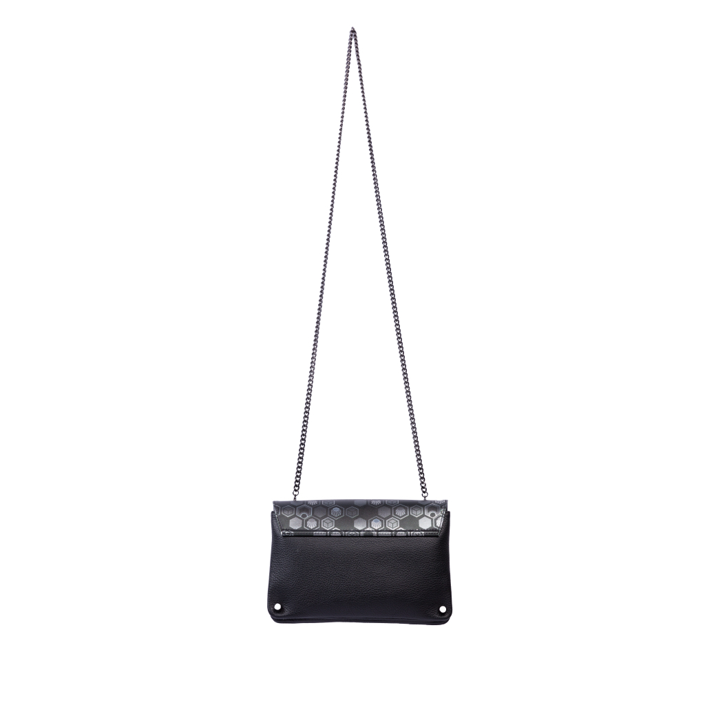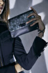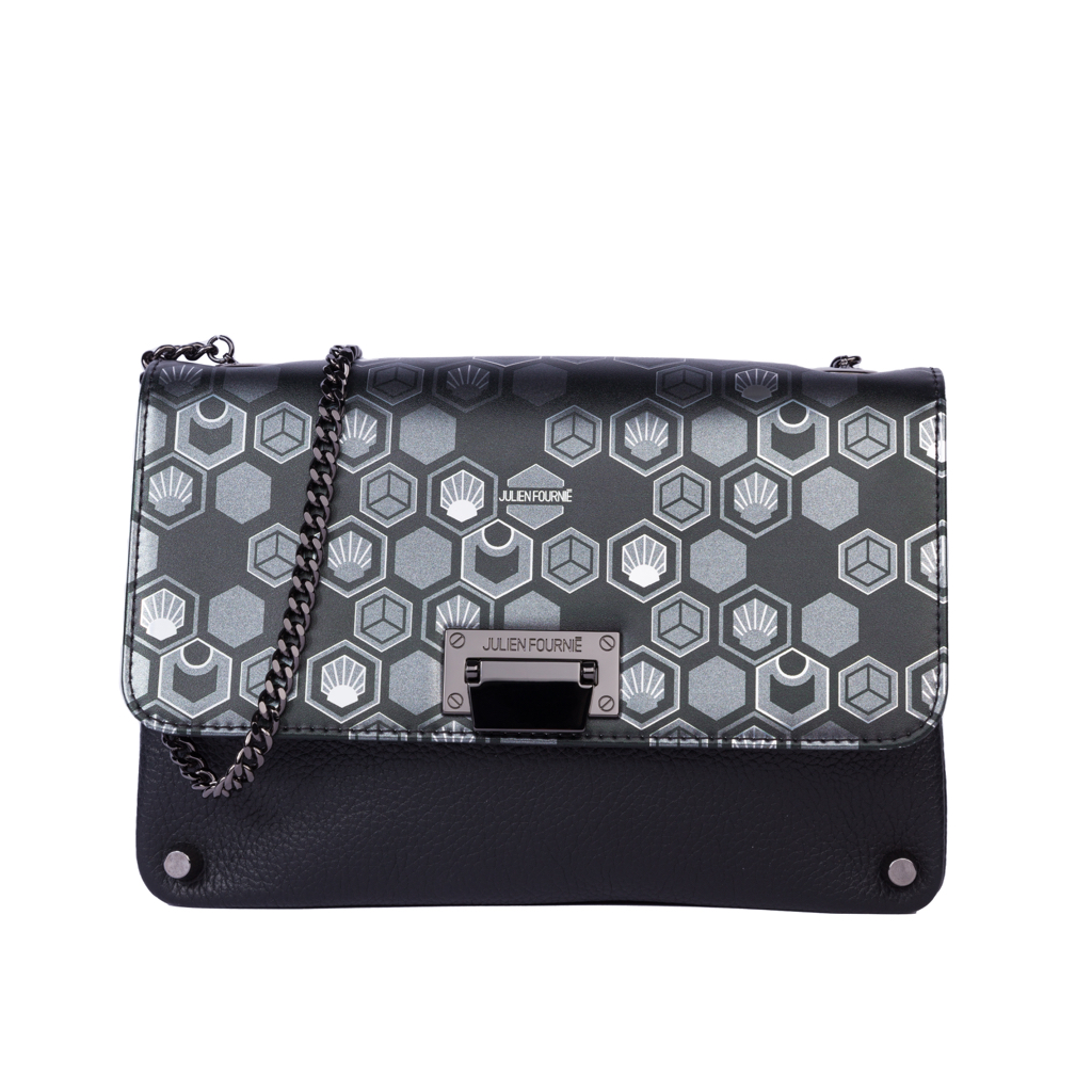 L’ultime expression du luxe se retrouve dans ce sac de luxe, façonné dans une toile enduite effet miroir inédite, sérigraphiée du monogramme Hexagon imaginé par Julien Fournié, et agrémentée de soufflets latéraux en cuir noir d’exception.