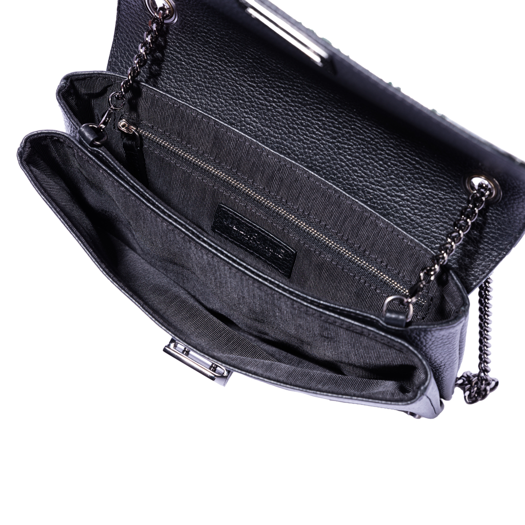 • Intérieur en faille gros-grain noire, combinant tenue et douceur, équipé de deux poches à double soufflet et d’une poche zippée pour organiser vos indispensables