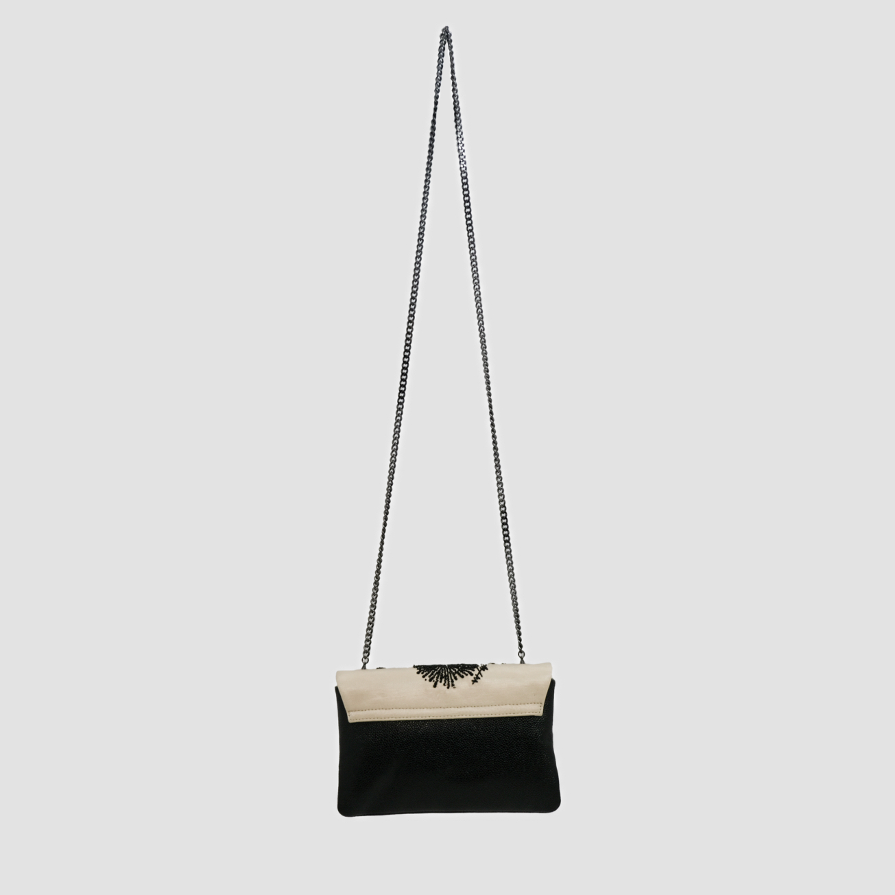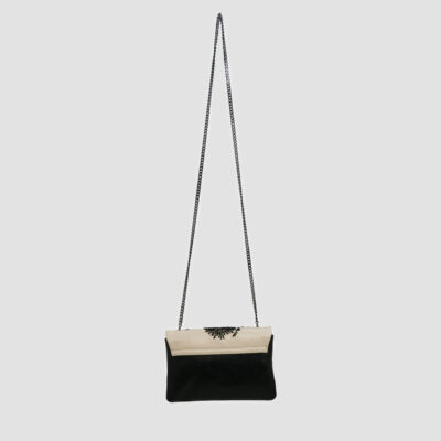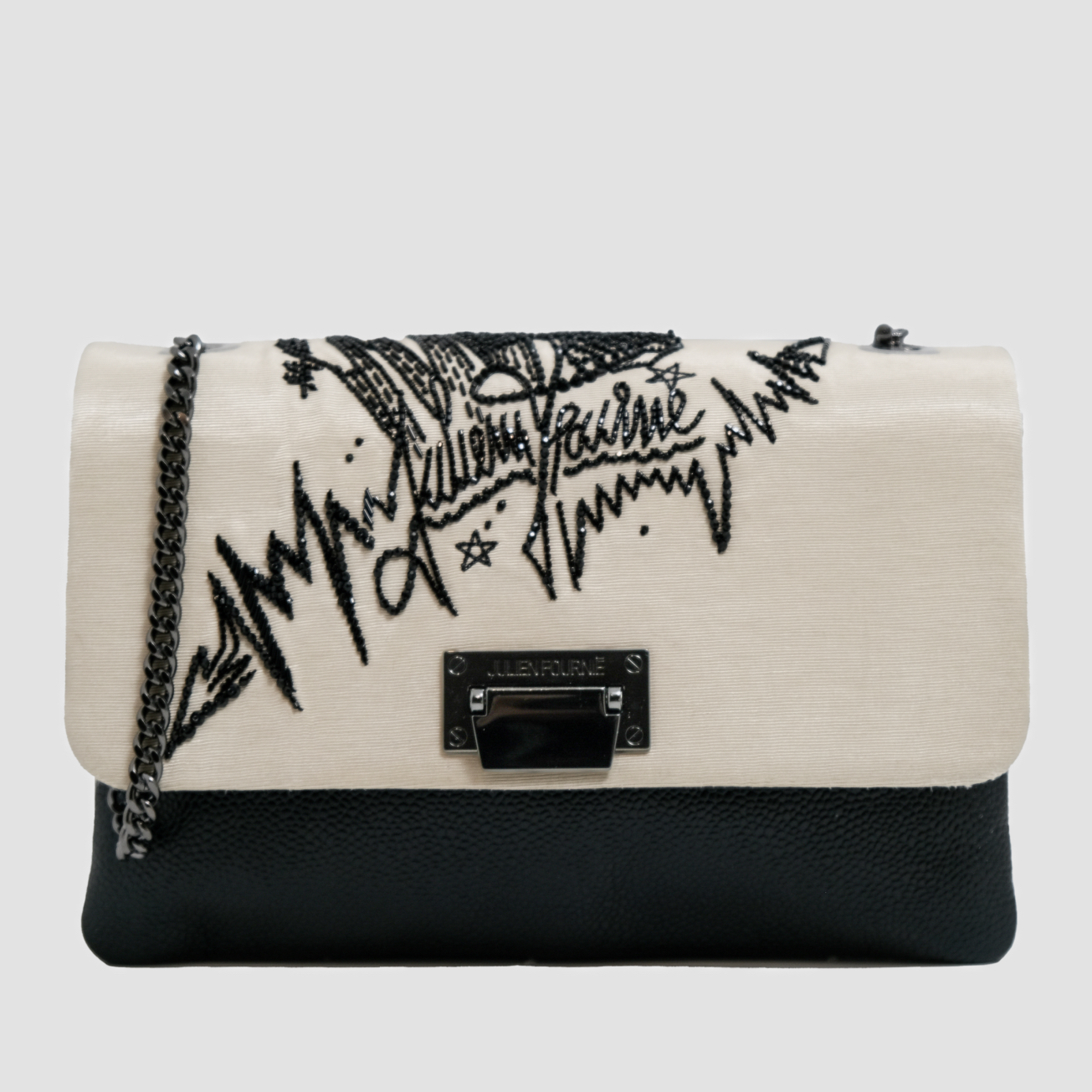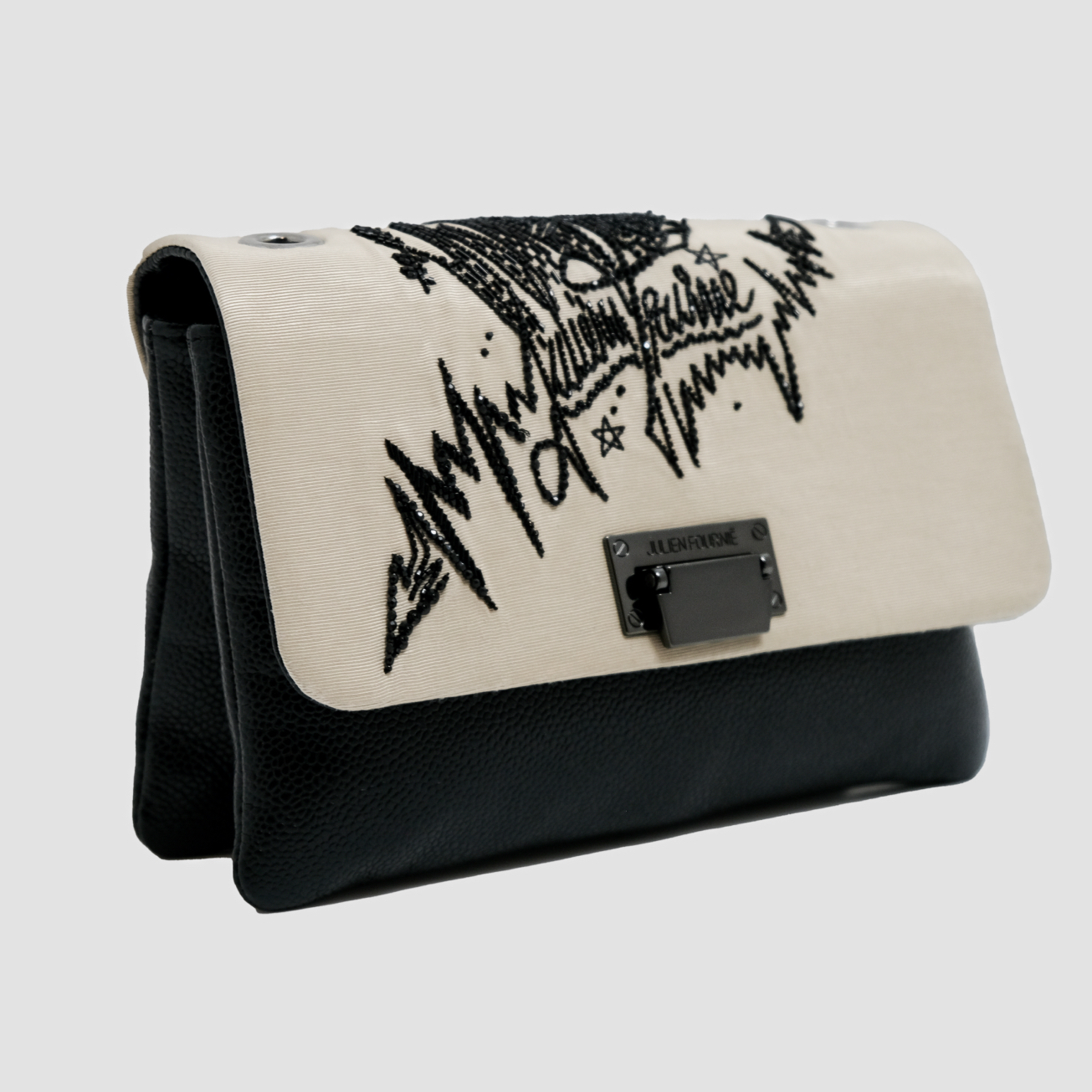 Ce sac Haute Couture associe la noblesse d’une faille de soie sable à la profondeur d’un cuir grainé noir. Sa surface est magnifiée par une broderie de tags signature Julien Fournié, réalisée en jais et en cristal noir. Chaque éclat, posé à la main, confère au modèle une intensité mystérieuse et une allure résolument contemporaine, transformant ce sac en véritable manifeste de style et de savoir‑faire couture.