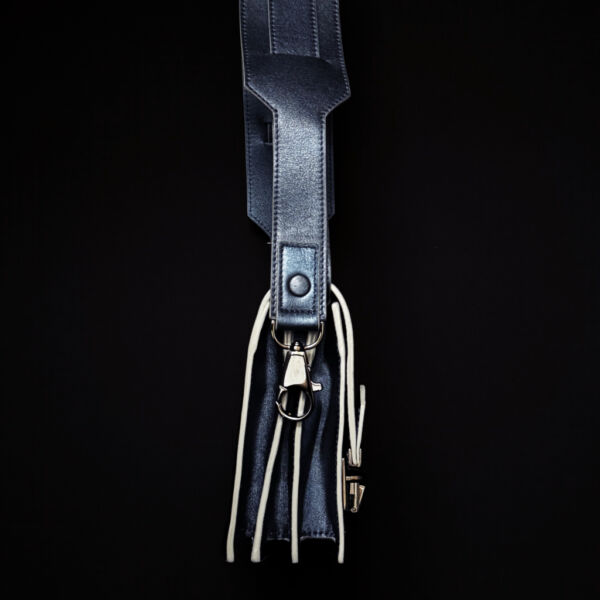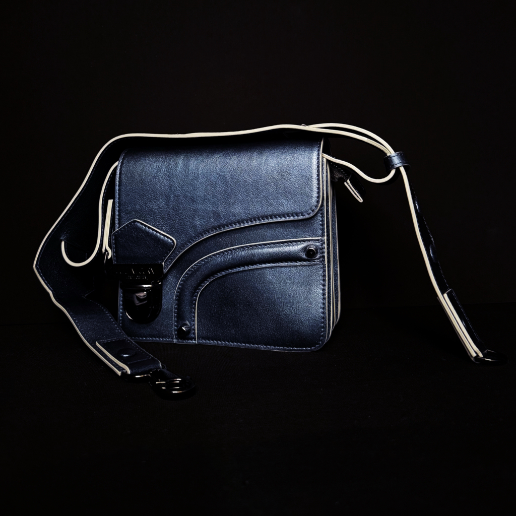 Compact et audacieux, il se décline ici dans un cuir bleu irisé aux reflets changeants, rehaussé par des bords gris argent.