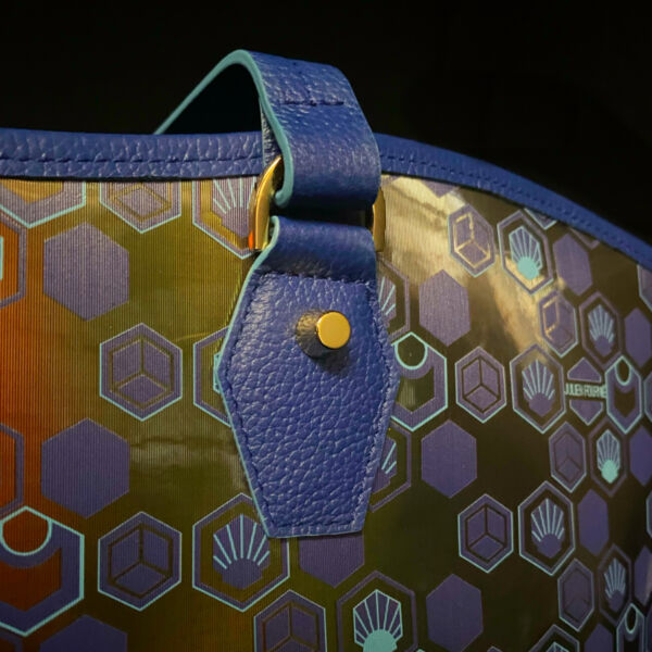 Plongez dans l’allure inédite de ce tote bag d’exception, où la toile enduite bleu profond aux reflets or dialogue avec le cuir grainé azur.