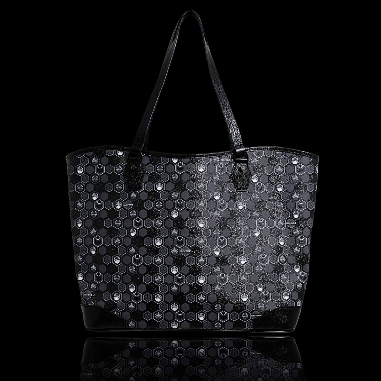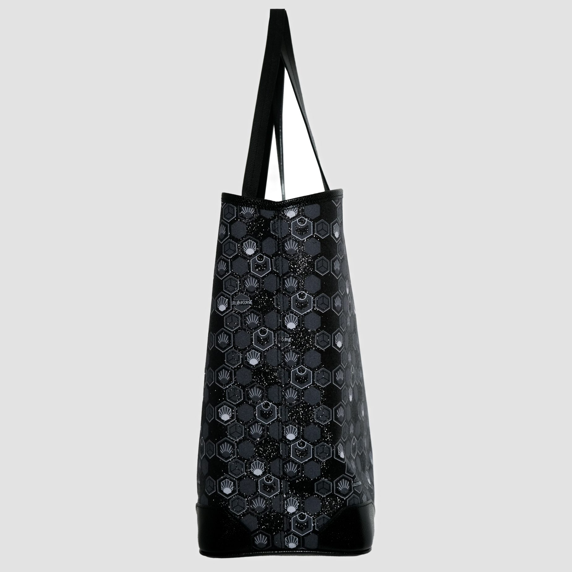 Inside, the oversized Julien Fournié logo, hot‑stamped in silver or gold, signs this tote with a pronounced Haute Couture imprint.
