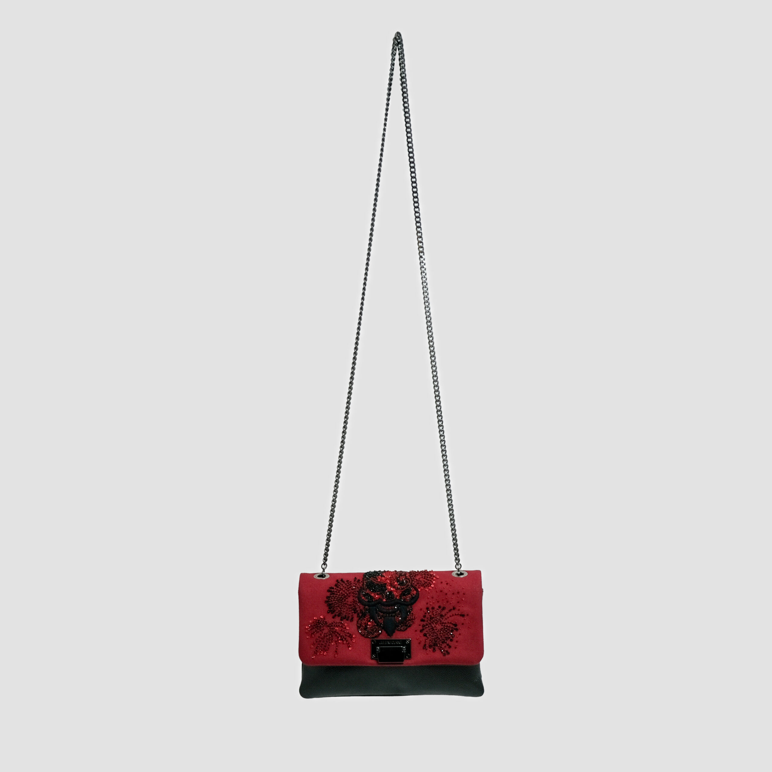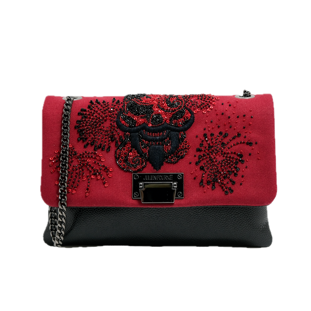The Haute Couture Pirate Premier bag marries the softness of cotton with the richness of ruby leather and the depth of black grained leather, creating a chromatic contrast that is at once bold and refined. Its surface is elevated by the hand‑executed embroidery of the signature tattoo from the First Misfits collection: precise satin stitches, metallic threads for luminous accents, and micro‑beads that sculpt the motif in relief.