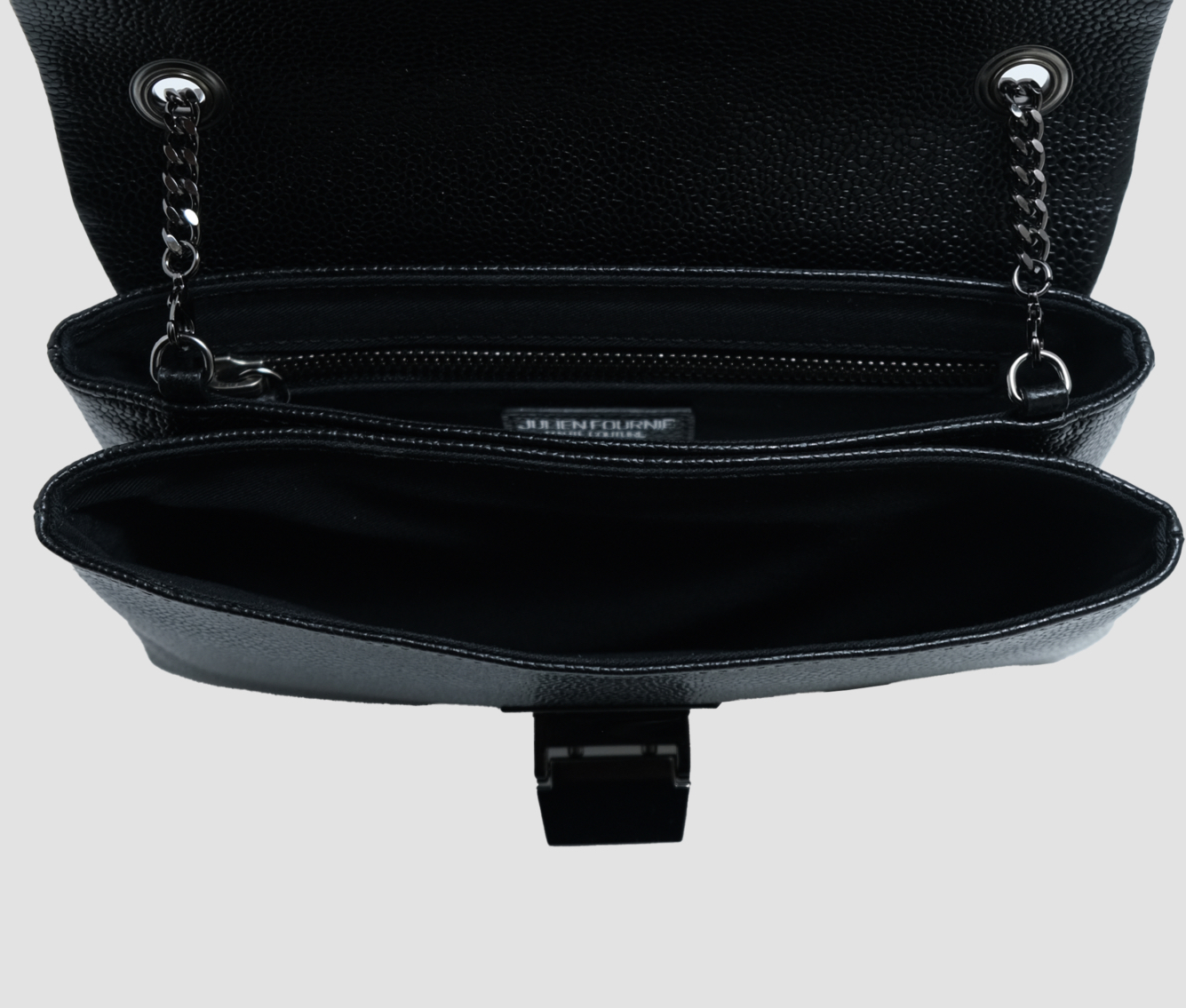 The removable 121 cm chain and its gunmetal-colored hardware lend a decidedly contemporary edge. Adjustable with a single click, it detaches in an instant, transforming the day bag into an elegant evening clutch.