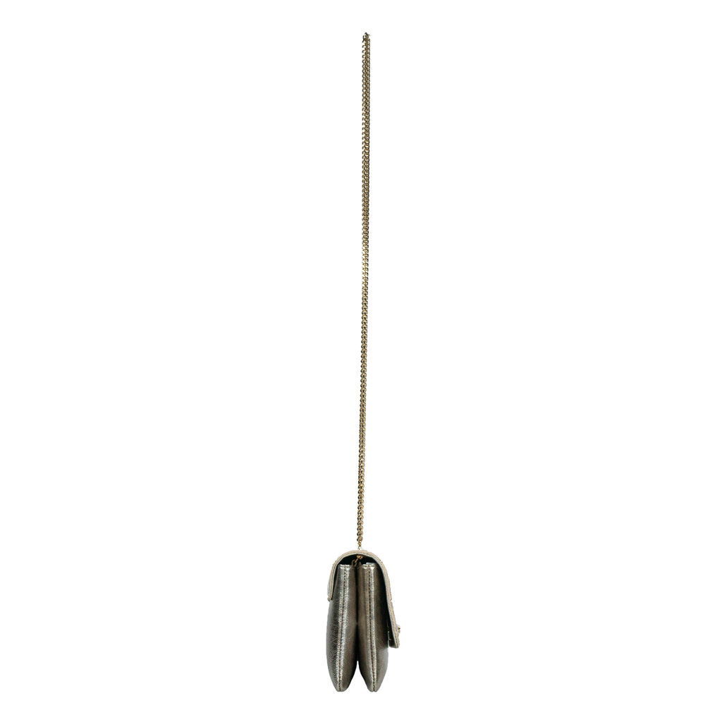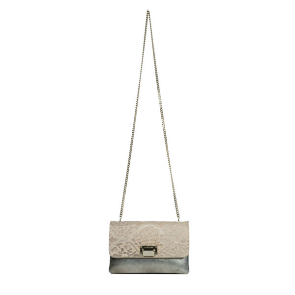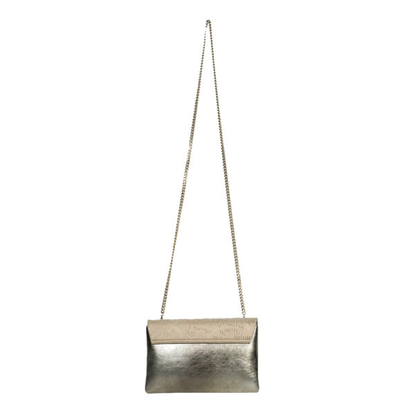 The side gussets are in gold leather. The removable and adjustable chain (length 121cm) and the metalwork are in light gold color.