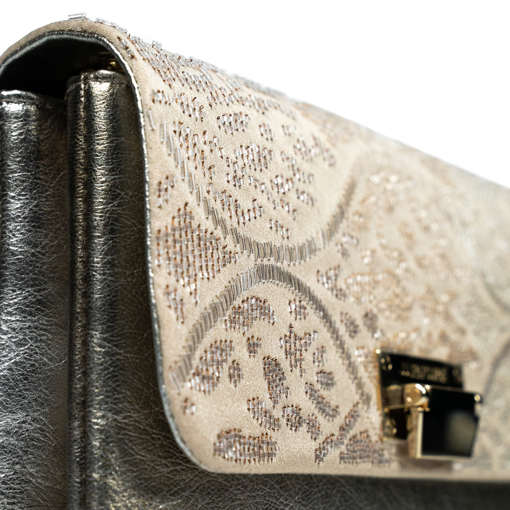 Unveiled on the runway of the First Creature Haute Couture collection, this luxury handbag is distinguished by its sumptuous silk lurex with a hypnotic shimmer.