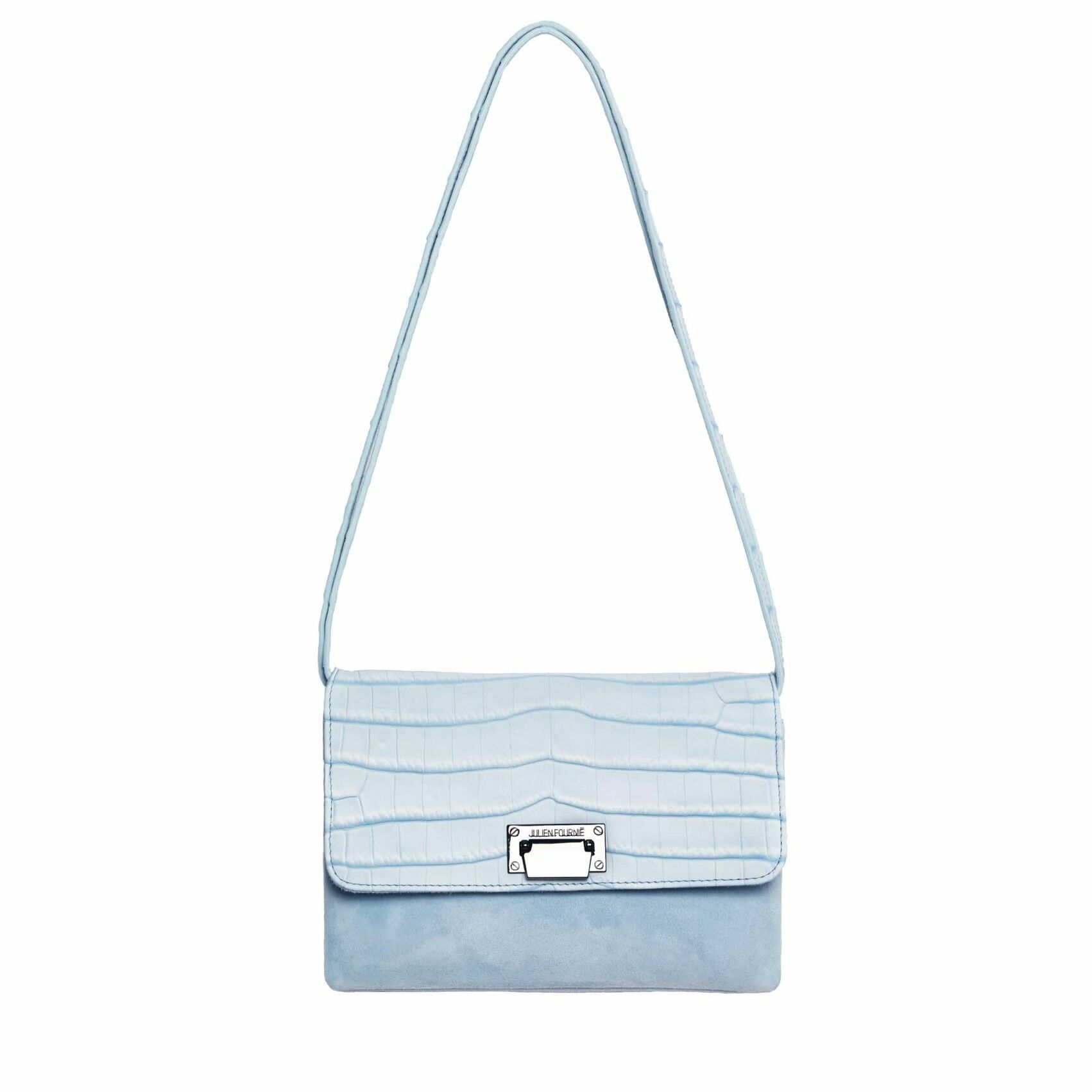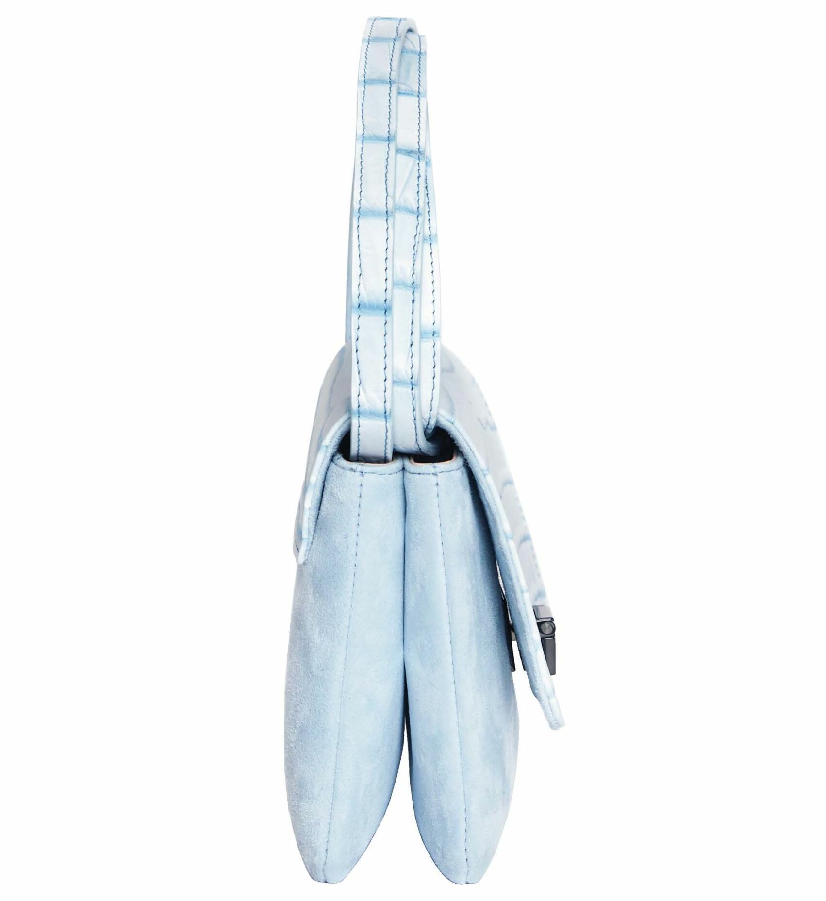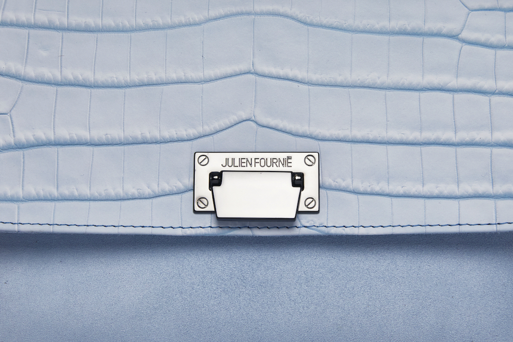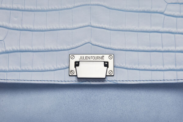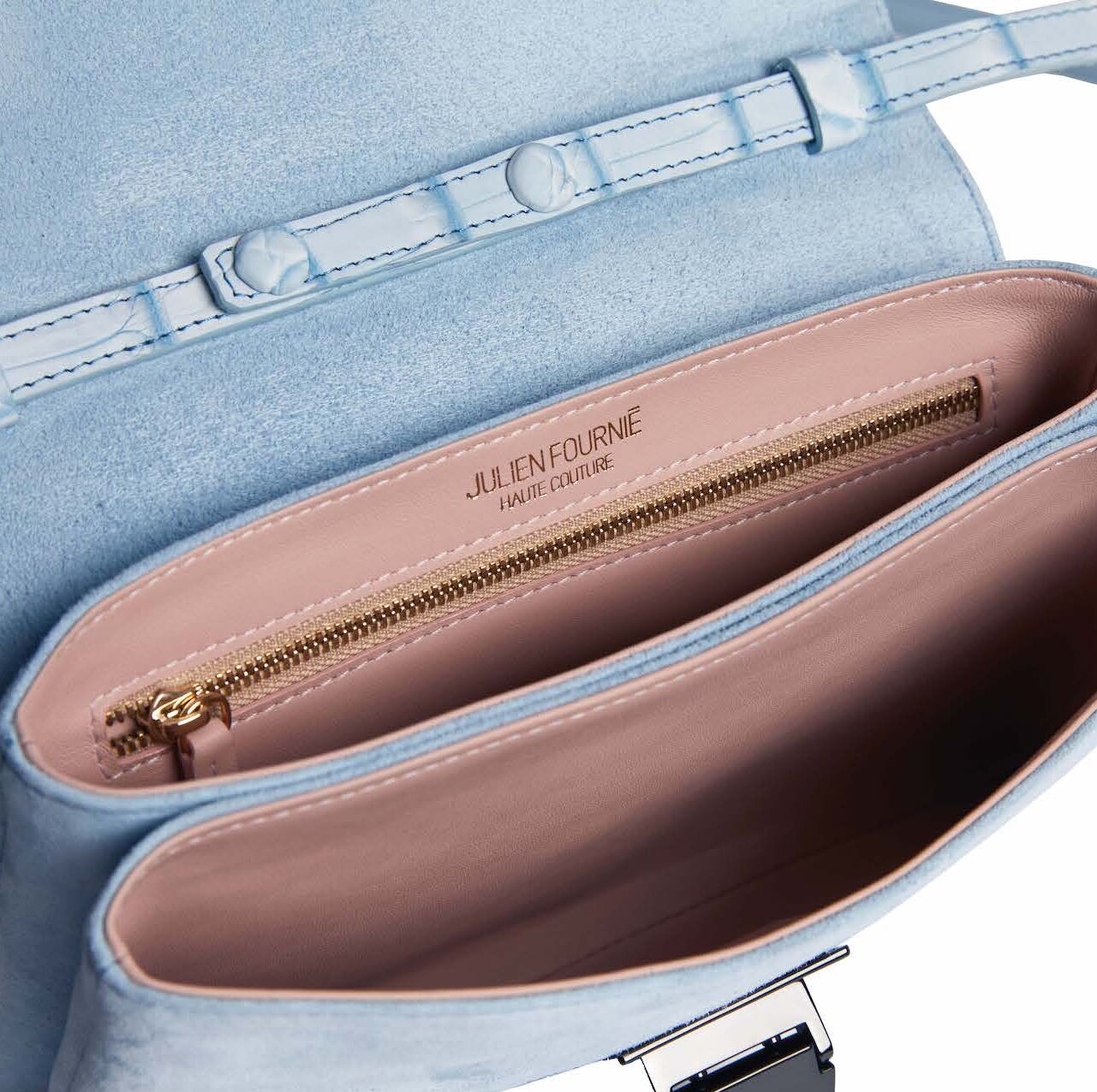 Immerse yourself in pure exclusivity: this Glacier-Blue handbag, a one-off creation by Julien Fournié, marries the regal allure of genuine alligator with the sumptuous softness of the finest calf-velour.
