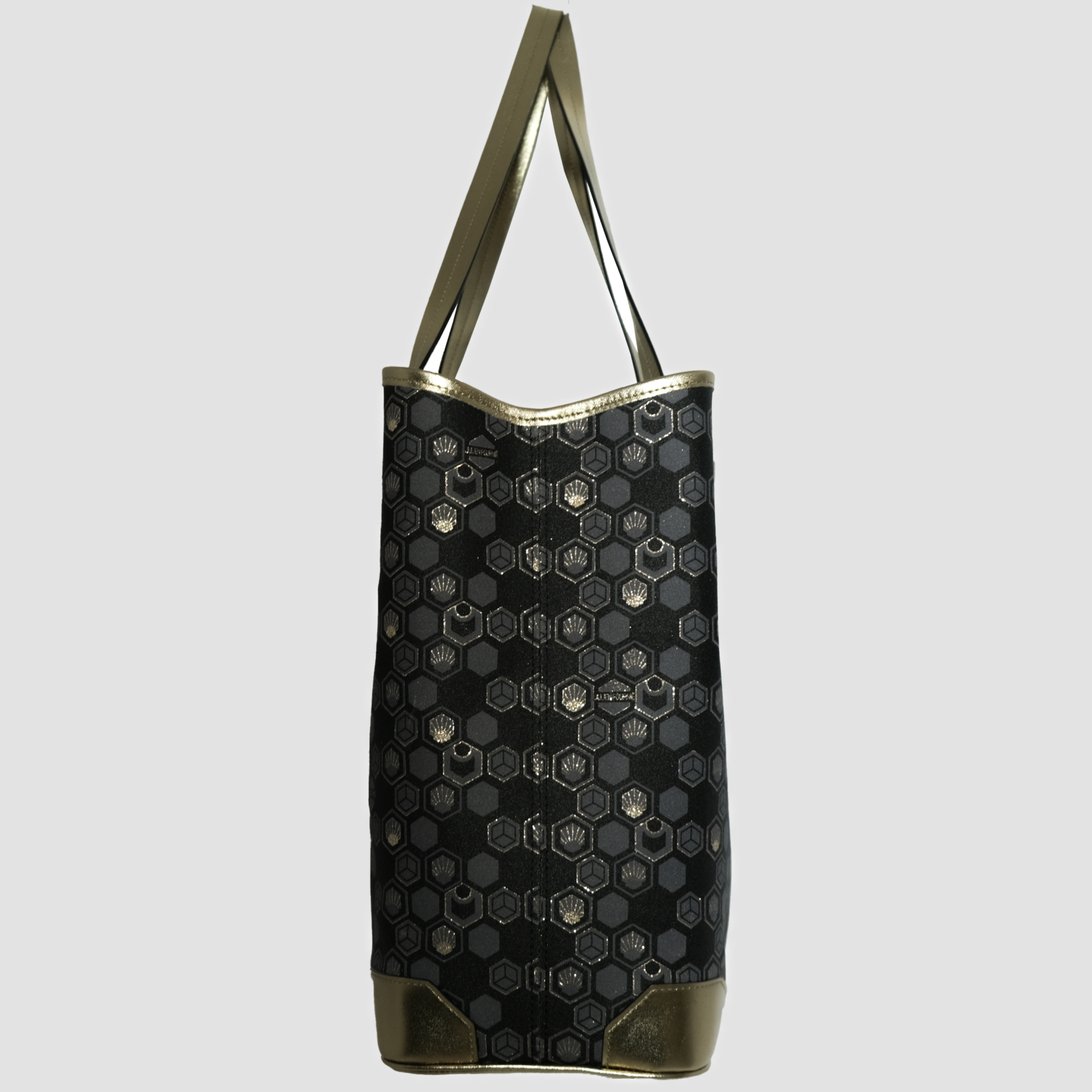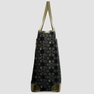 This luxury black tote bag is made of mirrored canvas, gunmetal color, coated and serigraphed with the exclusive Hexagon Monogram created by Julien Fournié.