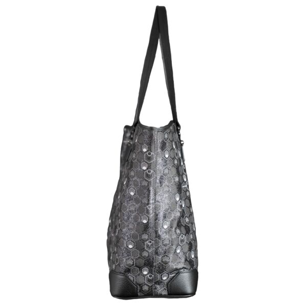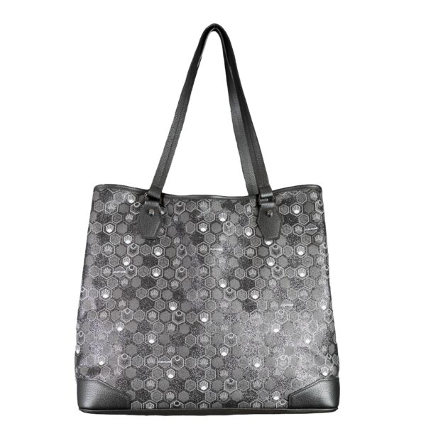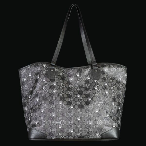This luxury black tote bag is made of mirrored canvas, gunmetal color, coated and serigraphed with the exclusive Hexagon Monogram created by Julien Fournié.