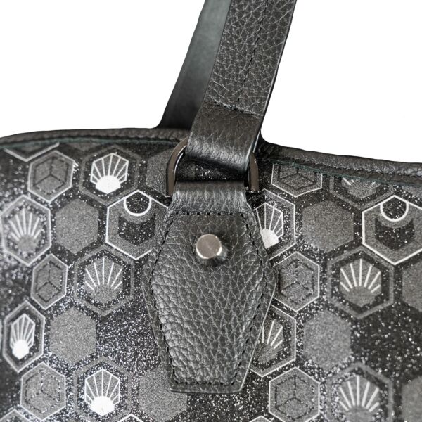 The Pollux Midnight Black tote bag in coated canvas and black grained leather details was presented at the First Vamps Haute Couture collection show. The discreetly sequined coated canvas of this luxury bag is screen-printed with the exclusive Hexagon monogram designed by Julien Fournié.