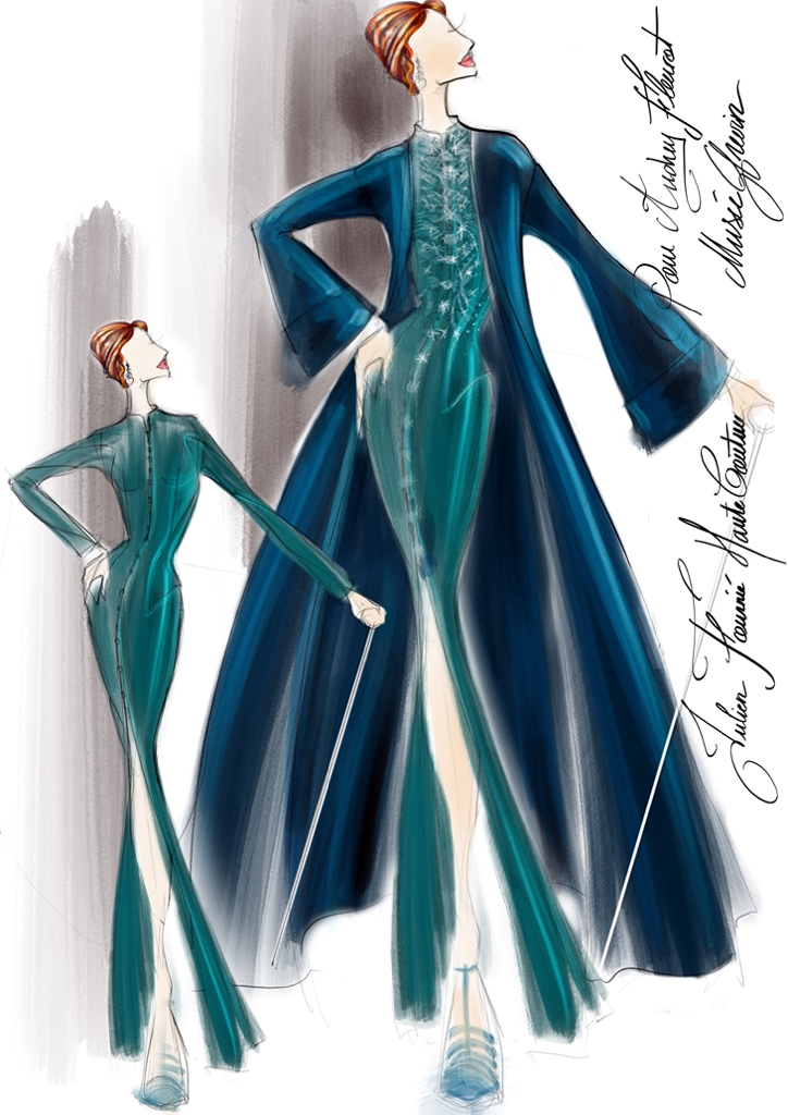 The ideation of the drawing of the dress created by Julien Fournié for Audrey Fleurot