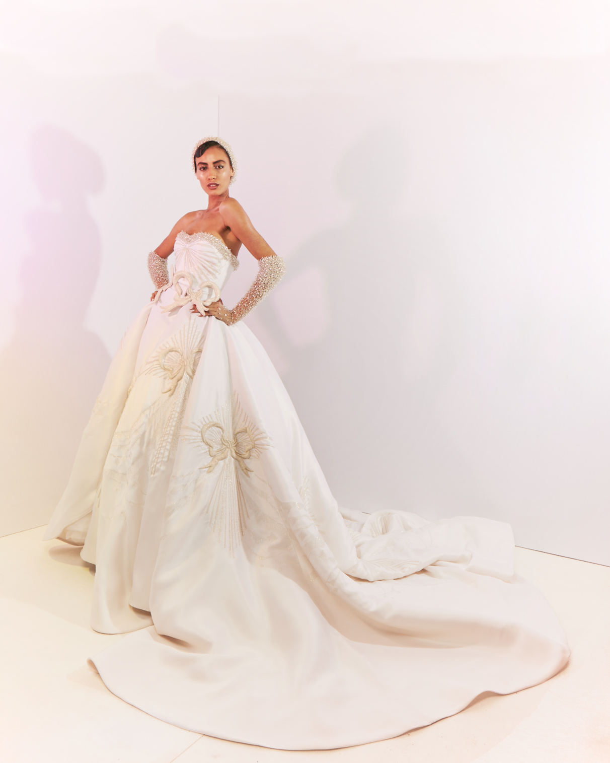 Along the neckline and gloves, crystal‑tube embroidery creates a dazzling 3D constellation effect.